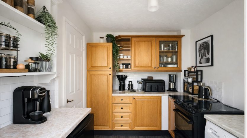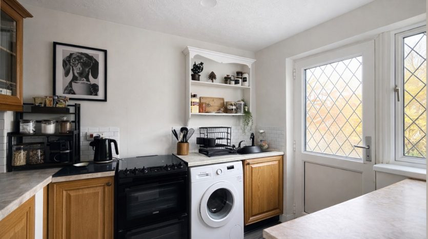 KITCHEN 9′ 5" x 7′ 0" (2.87m x 2.13m) This beautifully appointed property features a well-designed kitchen that benefits from a rear aspect featuring striking UPVC lead light double glazed windows, filling the space with natural light throughout the day. The kitchen is finished with dark grey wood effect laminate flooring, complemented by classic oak floor and wall-mounted cupboards offering ample storage. Beige laminate worktops and crisp white wall tiles create a clean, contemporary look, while the stainless steel sink and free-standing gas cooker add both style and functionality. There is designated space for essential appliances such as a washing machine, fridge, and freezer, making everyday living brilliantly convenient.