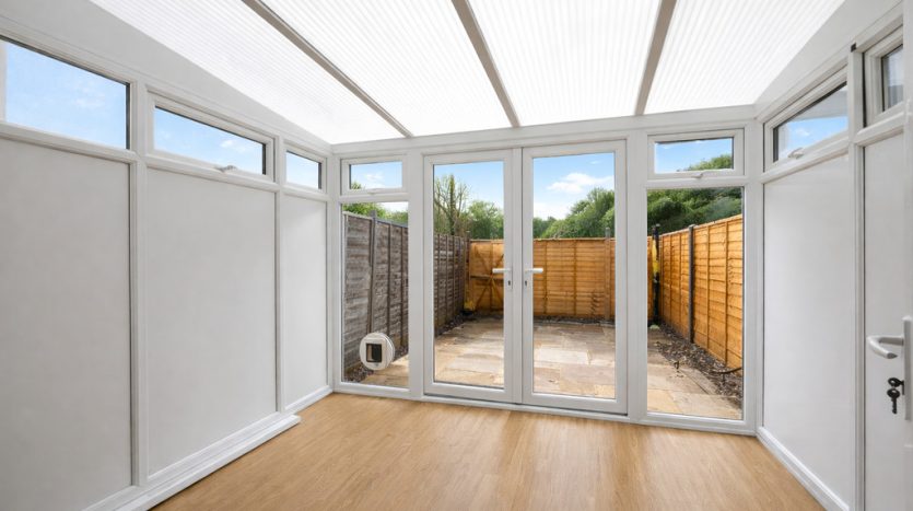 CONSERVATORY 10′ 1" x 9′ 3" (3.07m x 2.82m) A spacious conservatory – the ideal retreat for relaxing or entertaining guests throughout the year. With large UPVC double-glazed windows and doors opening out on to the rear garden, natural light pours in, illuminating the elegant oak laminate wood flooring and creating a welcoming atmosphere. This wonderful addition offers versatile living space, seamlessly connecting to the well-maintained outdoor area, perfect for summer gatherings or quiet relaxation.