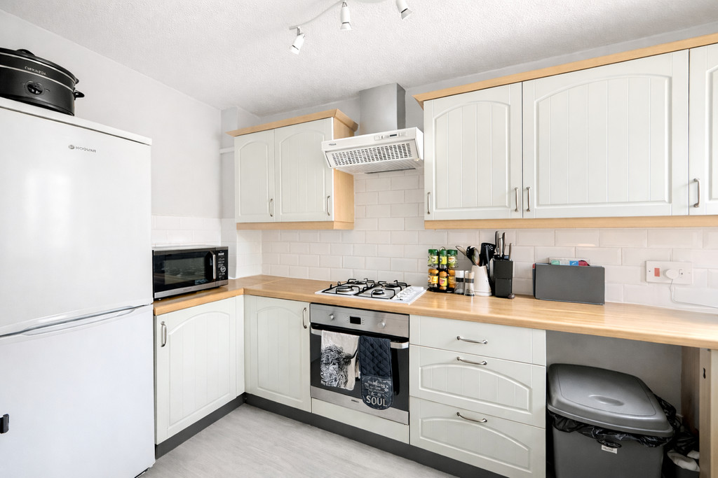White, floor and wall-mounted cupboards offer a crisp, clean vibe whilst providing ample storage. The elegant beech worktop houses a gleaming stainless steel sink with co-ordinating white splashback tiles-a look that is as timeless as it is practical. The property is offered complete with a Hoover fridge freezer and washing machine, ensuring the essentials are catered for from day one. There is dedicated space for a slimline dishwasher, along with a built-in oven, gas hob, and extractor fan for all your cooking needs.