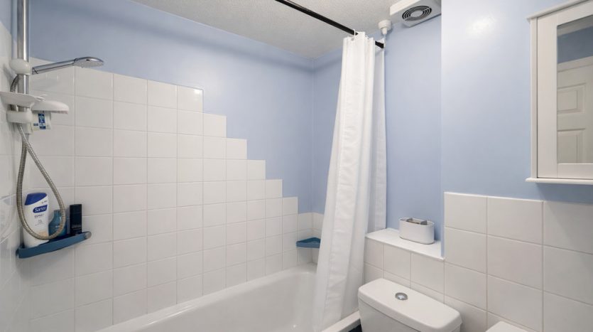 BATHROOM 6′ 1" x 5′ 2" (1.85m x 1.57m) Bathroom featuring stylish grey and black vinyl flooring, a contemporary pedestal basin, and a modern W.C. Enjoy the comfort of a full-sized bath complete with an overhead mains shower, complemented by elegant white splashback tiles. An efficient extractor fan ensures a fresh and comfortable space.