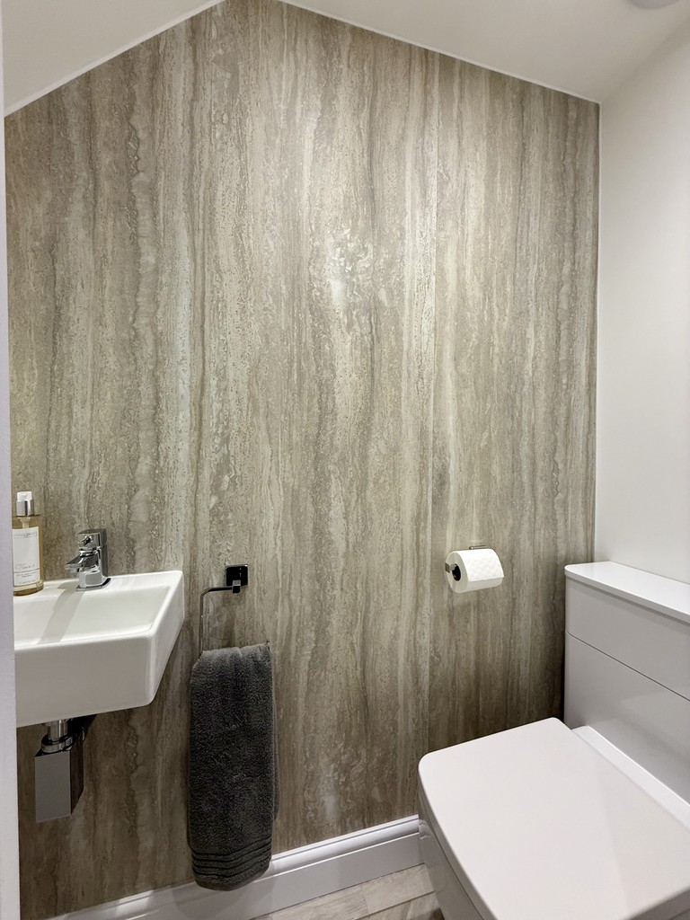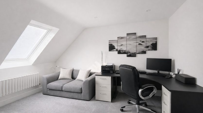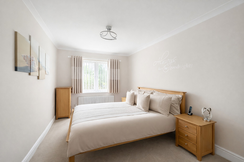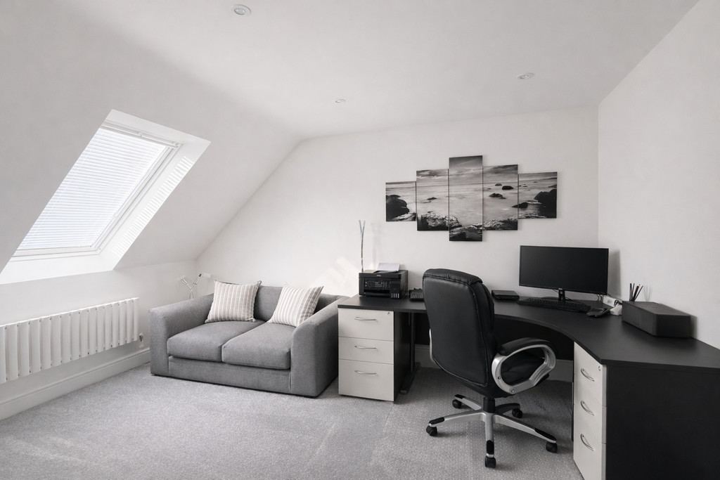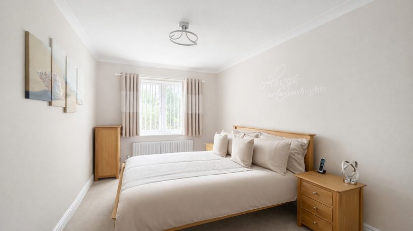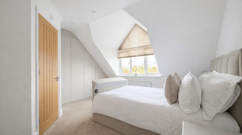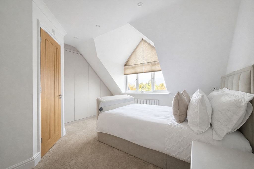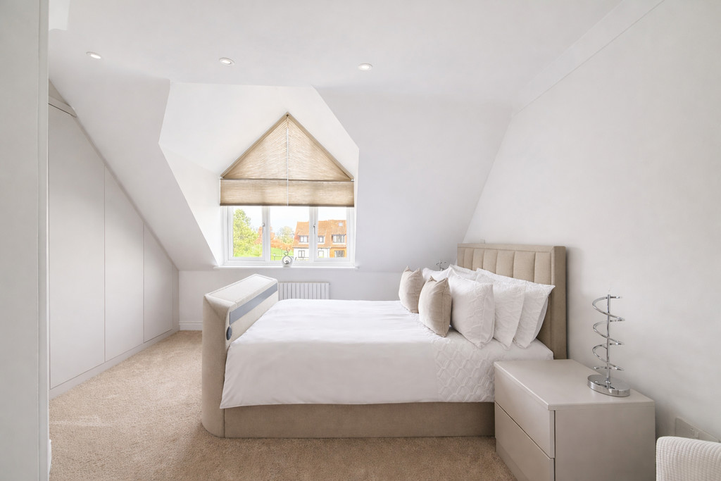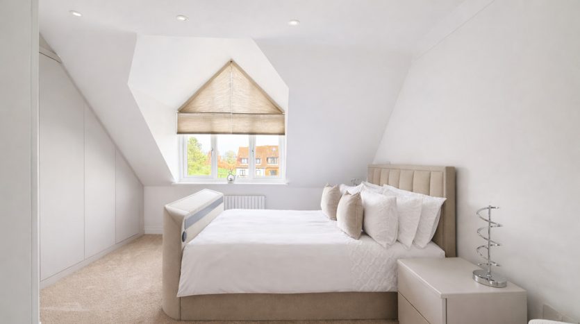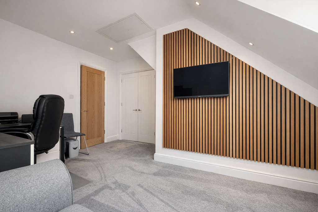 BEDROOM 2 13′ 7" x 12′ (4.14m x 3.66m) Beautifully presented bedroom two, boasting spacious dimensions and a contemporary design. The soft plush grey carpets create a cosy and inviting atmosphere, complemented perfectly by the built-in double wardrobe and storage cupboard for all your belongings. Natural light floods the room through the front aspect double glazed velux window with blind highlighting the feature wood panel wall with charming elegance.