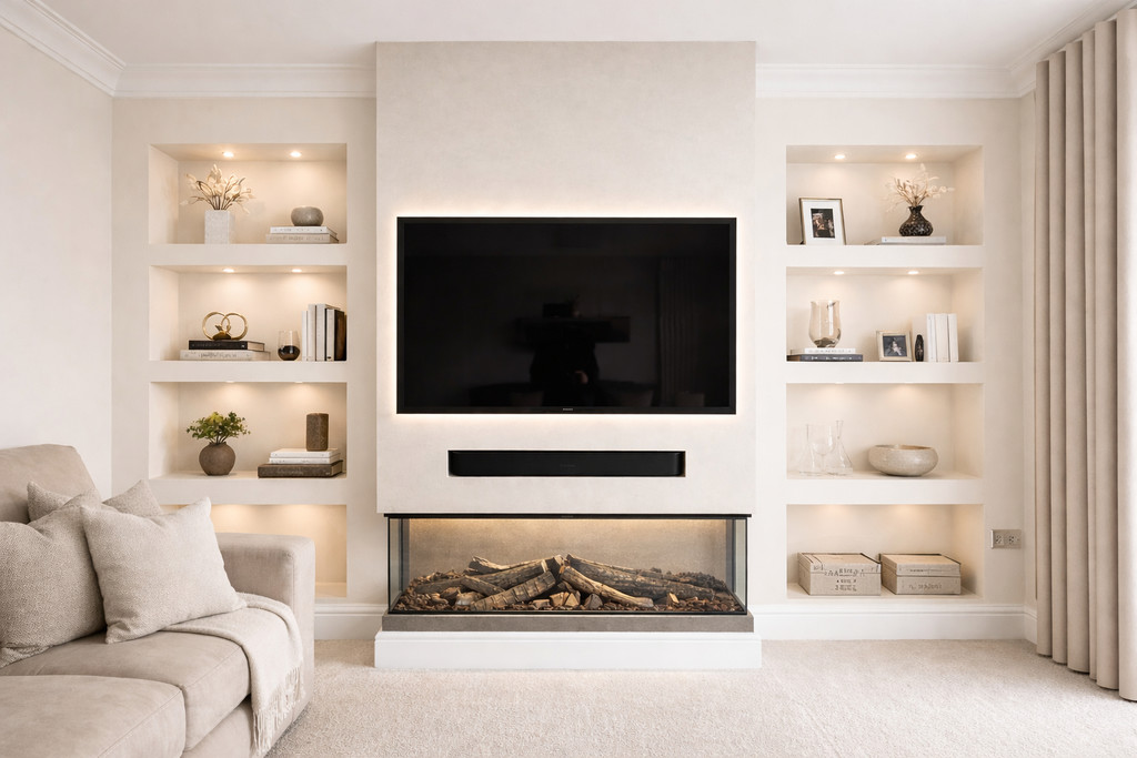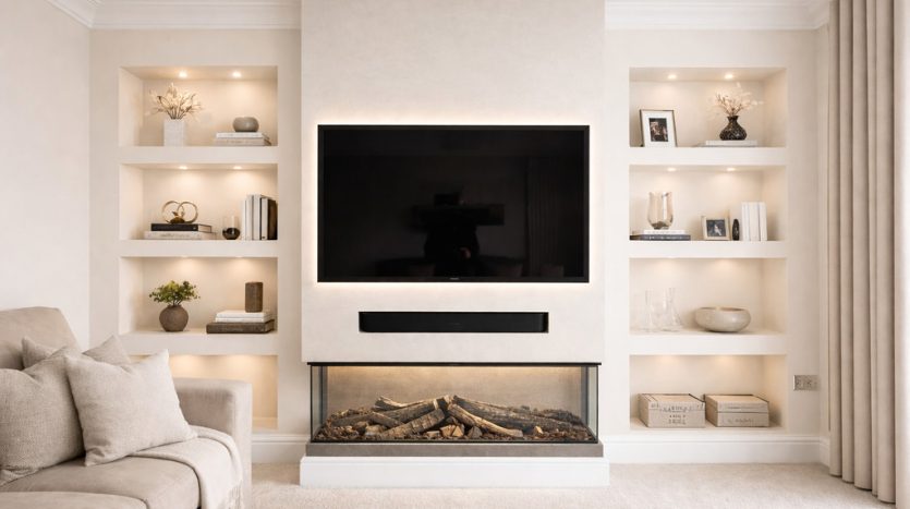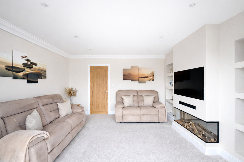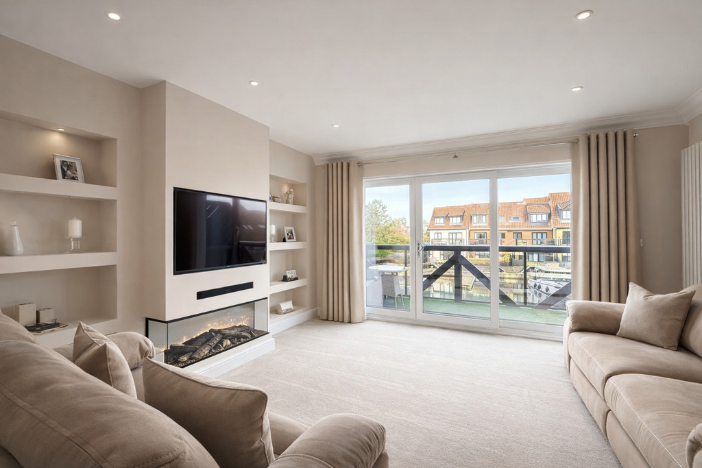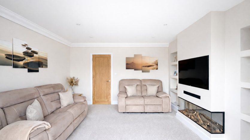 LOUNGE 13′ 9" x 13′ 4" (4.19m x 4.06m) A spacious lounge adorned with plush beige carpeting. The side wall features built-in units for TV and entertainment, complemented by a real wood log electric fire for added charm. Drenched in natural light, the lounge also benefits from a strip of LED lights, creating a truly mesmerizing ambiance.