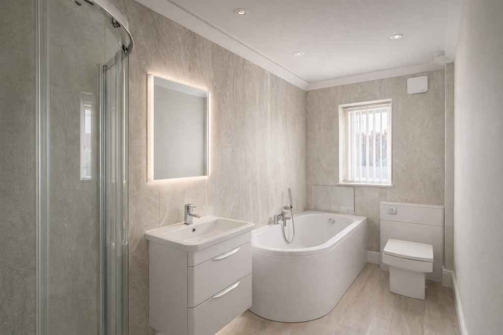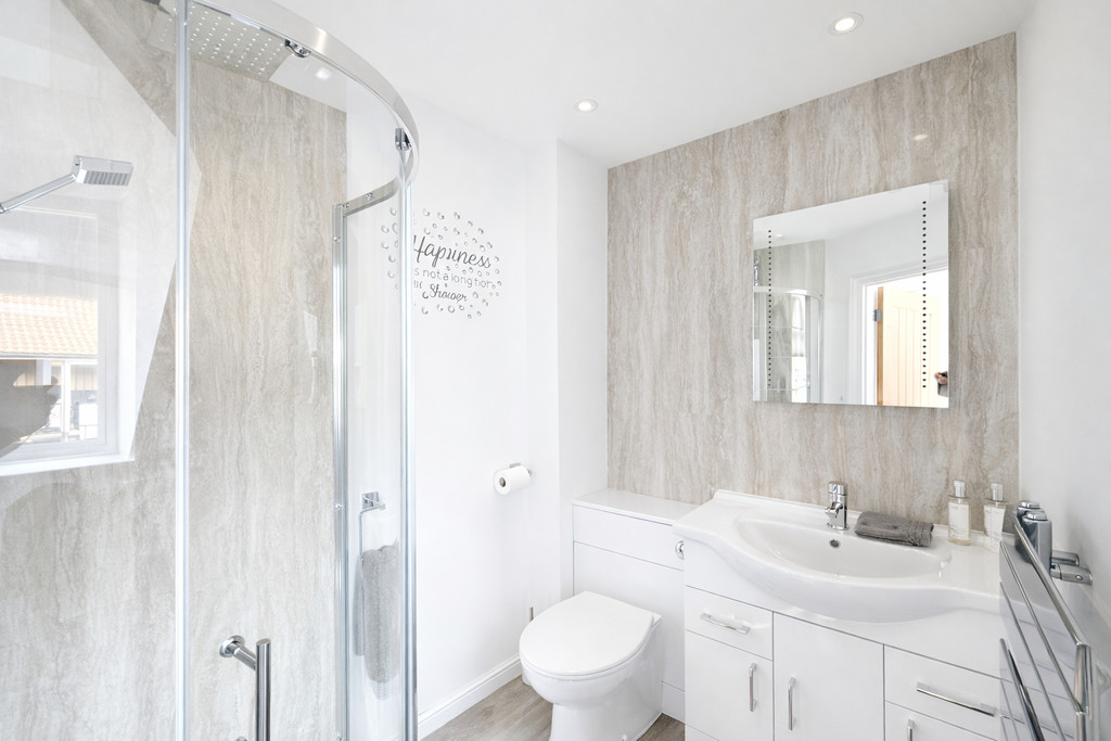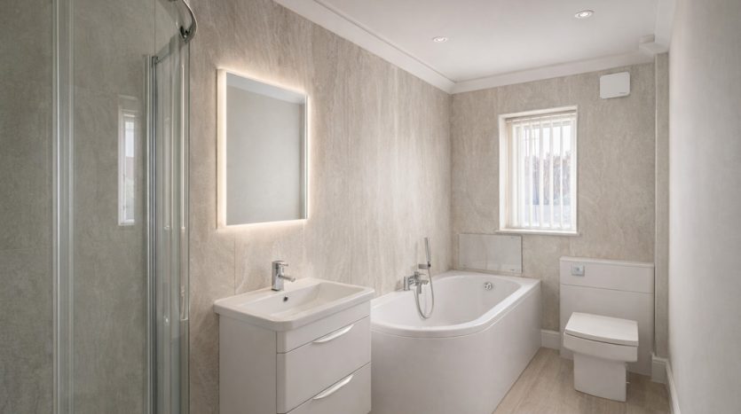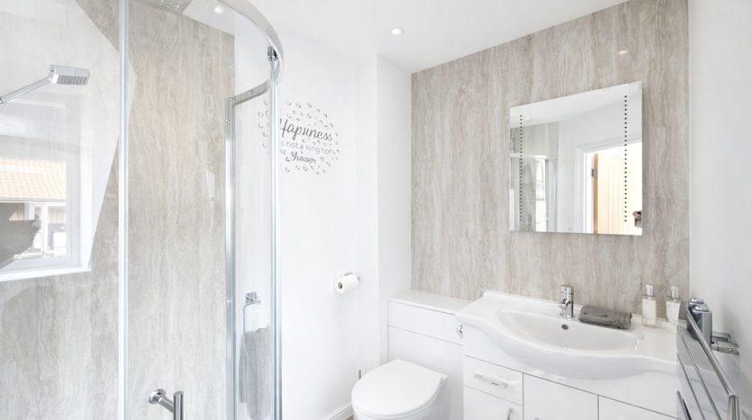 BATHROOM 11′ 3" x 4′ 7" (3.43m x 1.4m) Bathroom finished to the highest standard. Step inside to find laminate light oak flooring, a front aspect double glazed upvc window letting in plenty of natural light, and a luxurious corner shower and white bath complete with a mirrored TV for indulgent relaxation. Wash basin and toilet also ample storage space, while a good-sized vanity LED mirror adds a touch of style. The walls are adorned with easy-to-maintain panel tile walling, and a heated towel rail ensures warmth and comfort.