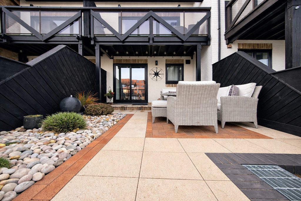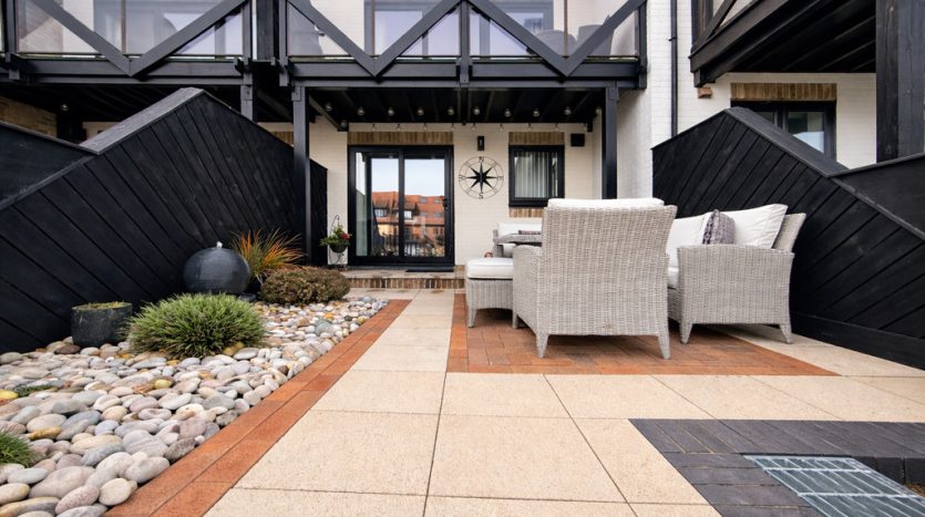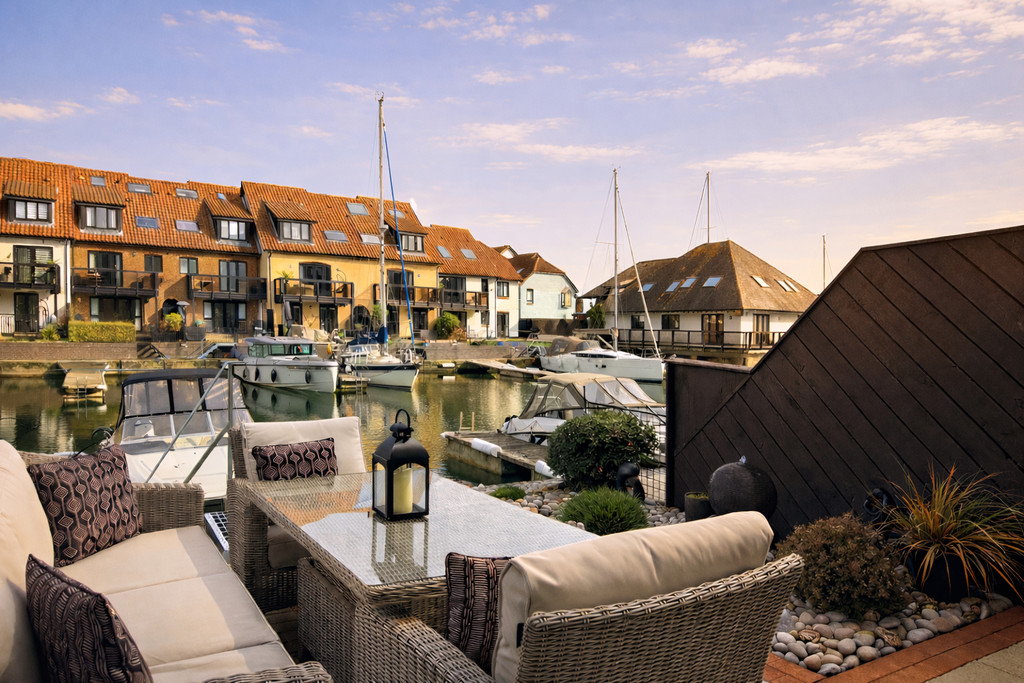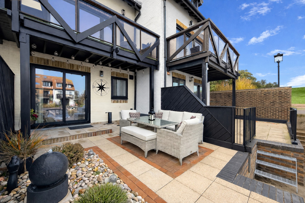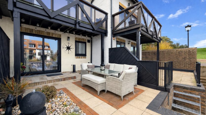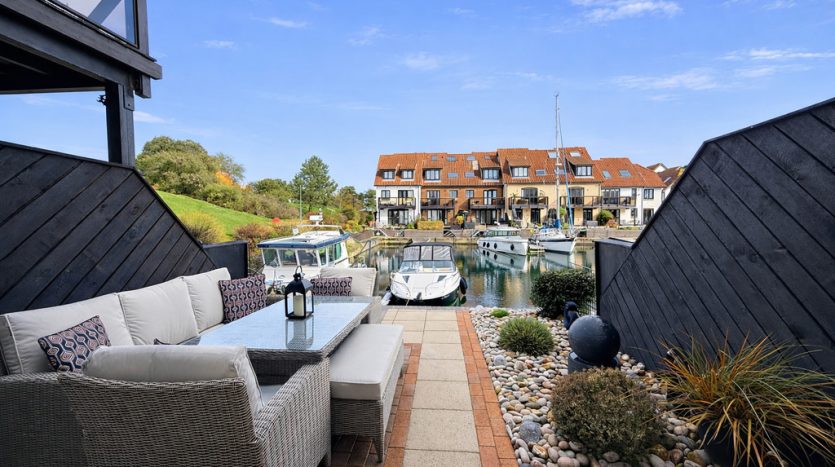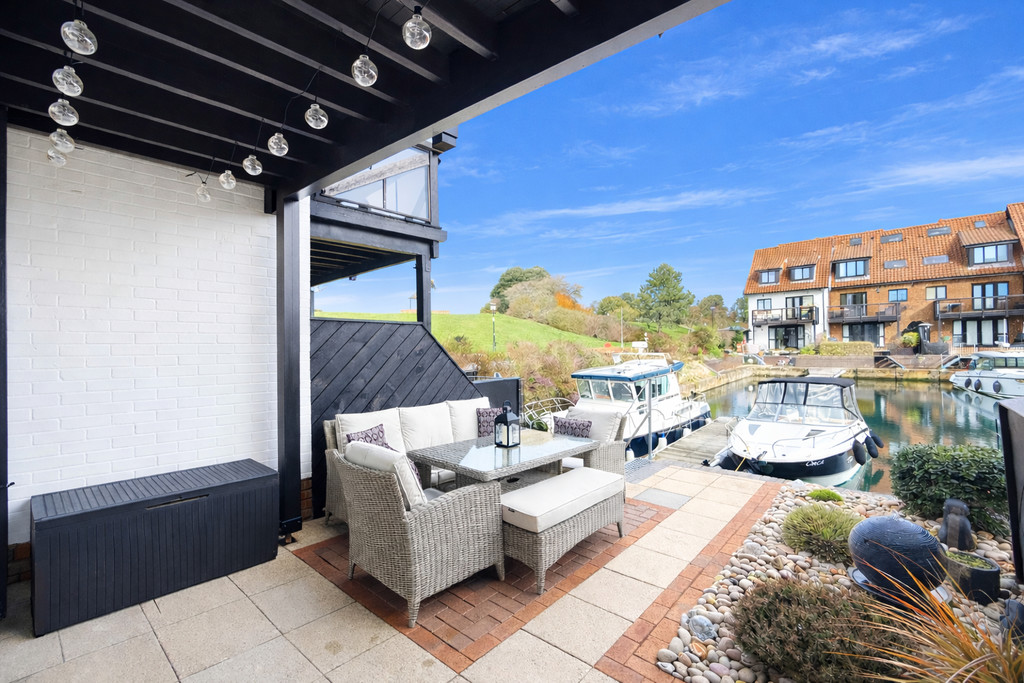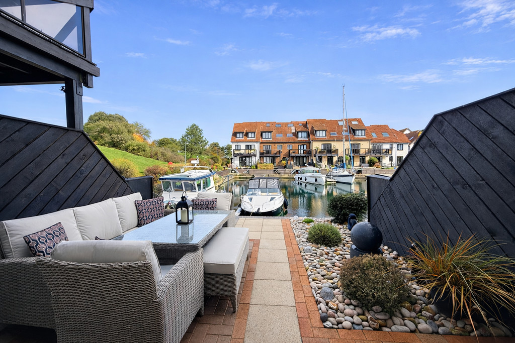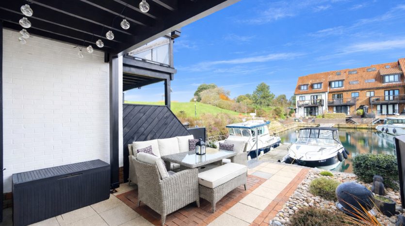 SUN TERRACE A beautiful sun terrace overlooking the marina. Step outside onto the new paved terrace with a seating area, perfect for relaxing and entertaining whilst enjoying the scenic views. Additionally, the shingle area with a water feature adds a touch of tranquility to the outdoor space. outside tap and two sets of outside sockets