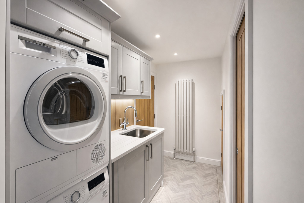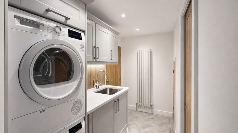 UTILITY ROOM 9′ 3" x 4′ 6" (2.82m x 1.37m) Utility room with striking Amitco dusted oak flooring. The space is equipped with slots for your washing machine and tumble dryer, along with a stainless steel sink unit offering ample cupboard space and plinth LED lighting. A sliding solid oak door leads to a separate W.C. and wash basin, along with additional storage cupboards before granting access to the internal garage.
