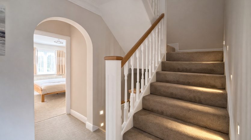 FIRST FLOOR LANDING The stairs leading up to the first floor landing. The stairs are beautifully illuminated with led lights sunken into the walls, creating a warm and inviting atmosphere. complimented with solid oak top banister rail.