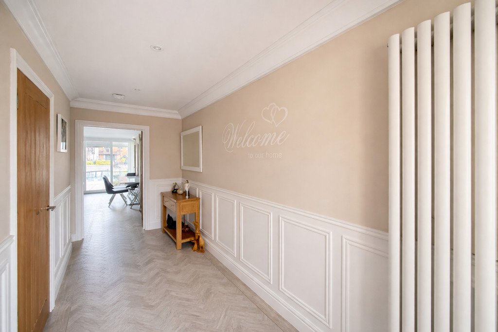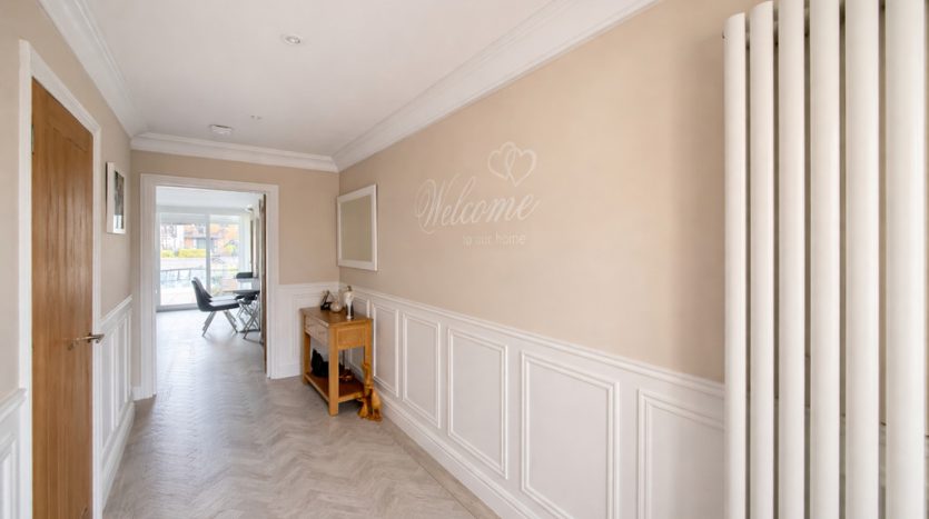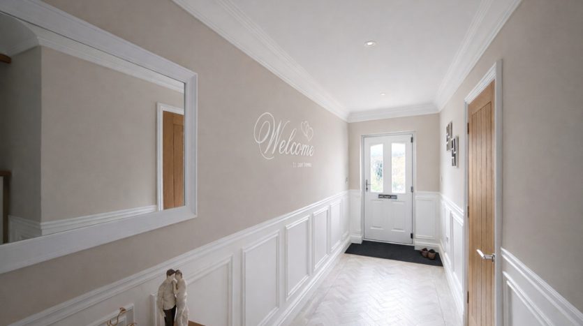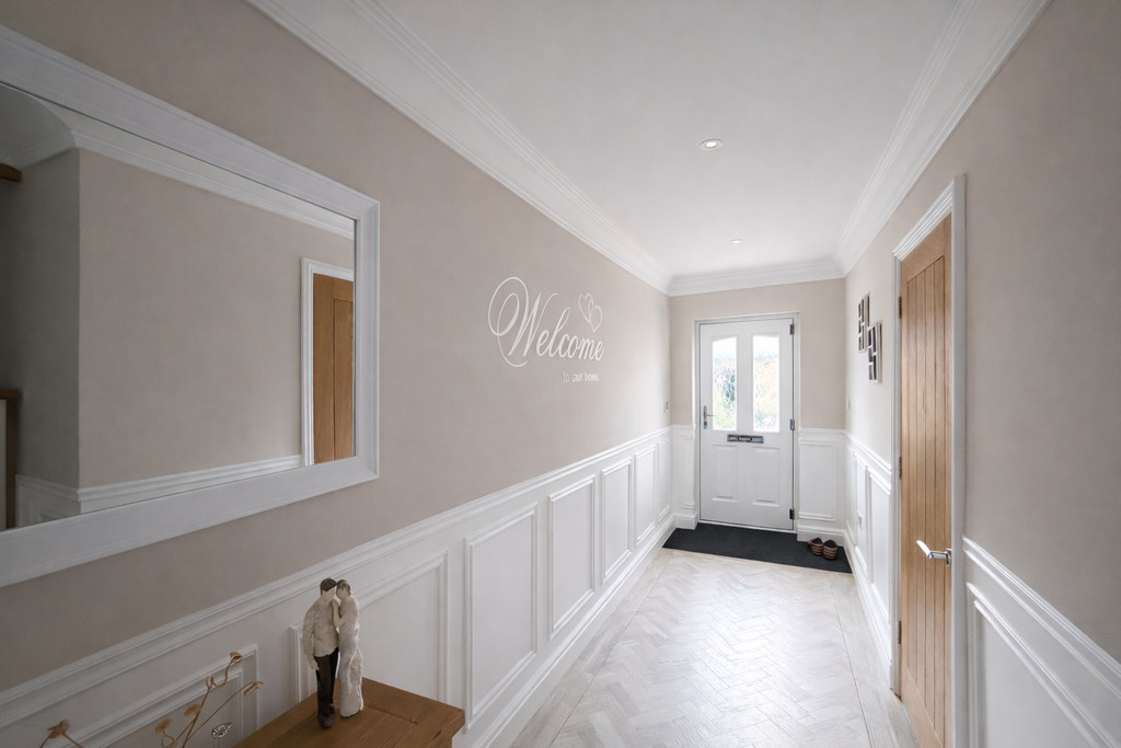 ENTRANCE HALL Step inside this stunning property through the grand entrance hall, featuring a new composite front door and luxurious Amitco Dusted Oak flooring. The spacious layout is illuminated by stylish LED strip lighting, guiding you to the utility room on the left and the inviting kitchen/diner straight ahead.