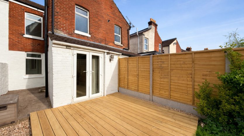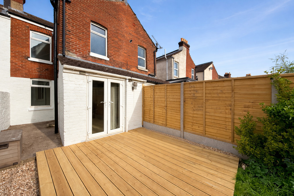 Outside Enclosed Rear Garden with Decking area and shed. On road Parking.