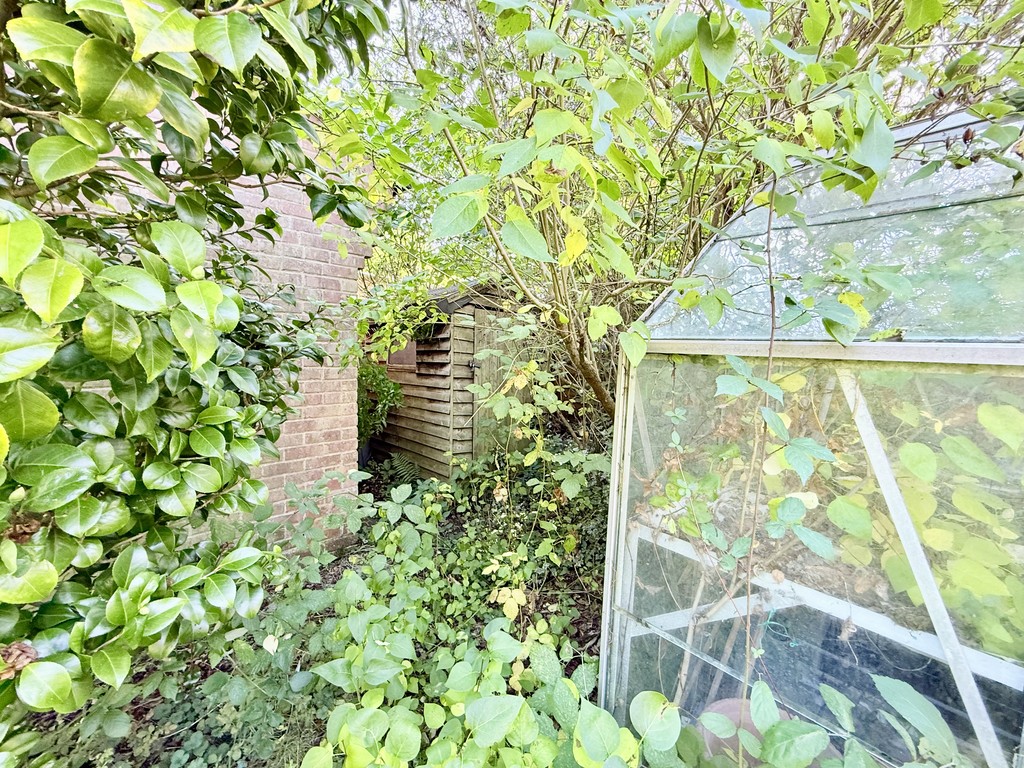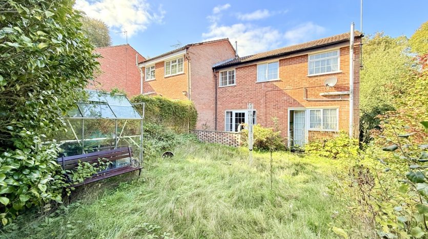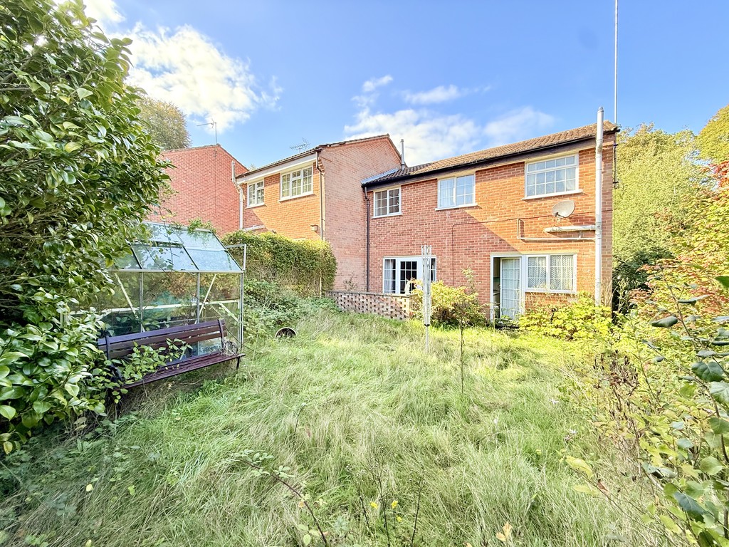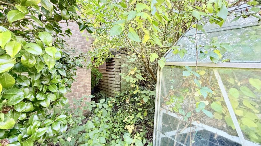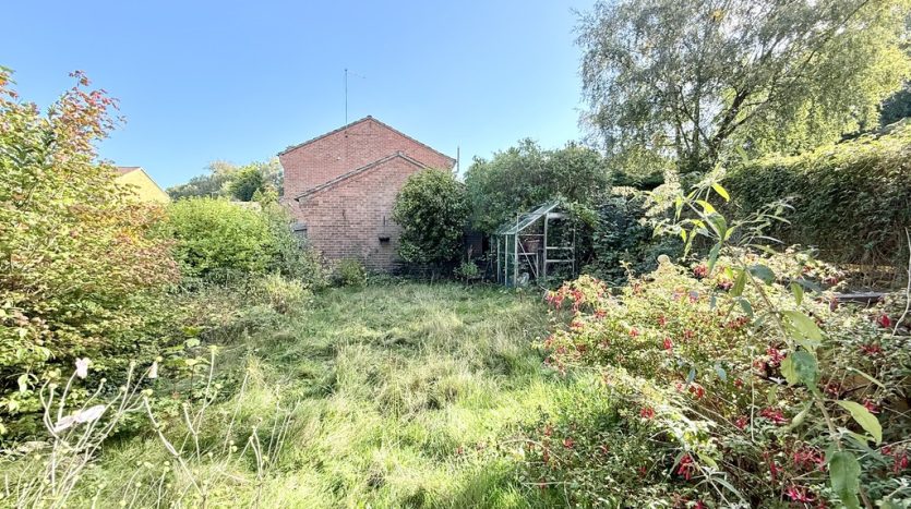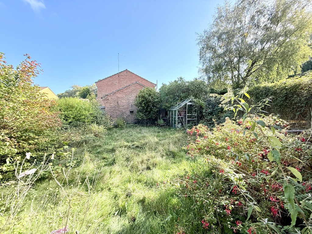 REAR OF PROPERTY The large back garden is mainly laid to lawn. There is a walled patio area outside the lounge patio doors, and there is also a door from the kitchen. This private garden is flanked with fencing and mature shrubs, There is a shed and a greenhouse and a variety of mature shrubs, and a convenient side gate leading to the garage.