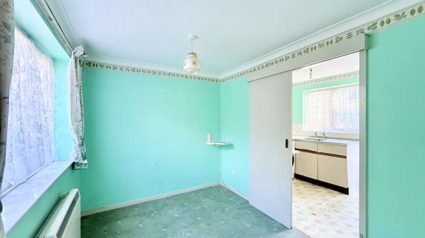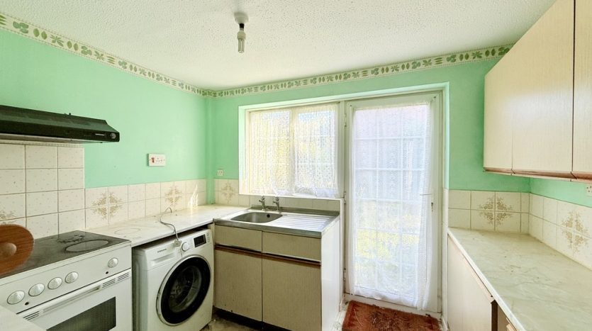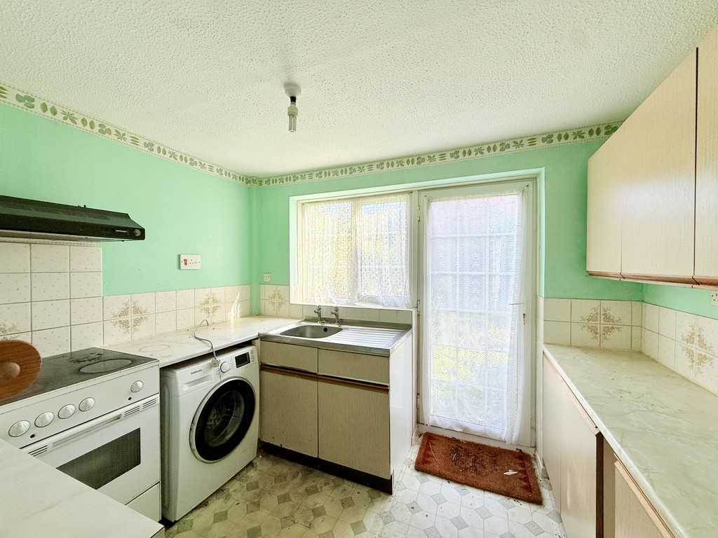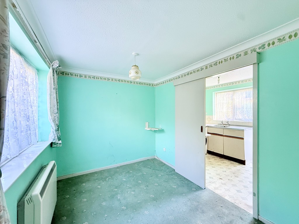 KITCHEN 9′ 8" x 7′ 1" (2.95m x 2.16m) In need of replacement, the kitchen has room for a range of base and wall units along with appliances. There is a window overlooking the rear garden and a glazed back door giving easy access to the garden, and making this a light and bright room. The kitchen space could easily be combined with the dining room to create a larger kitchen diner.
