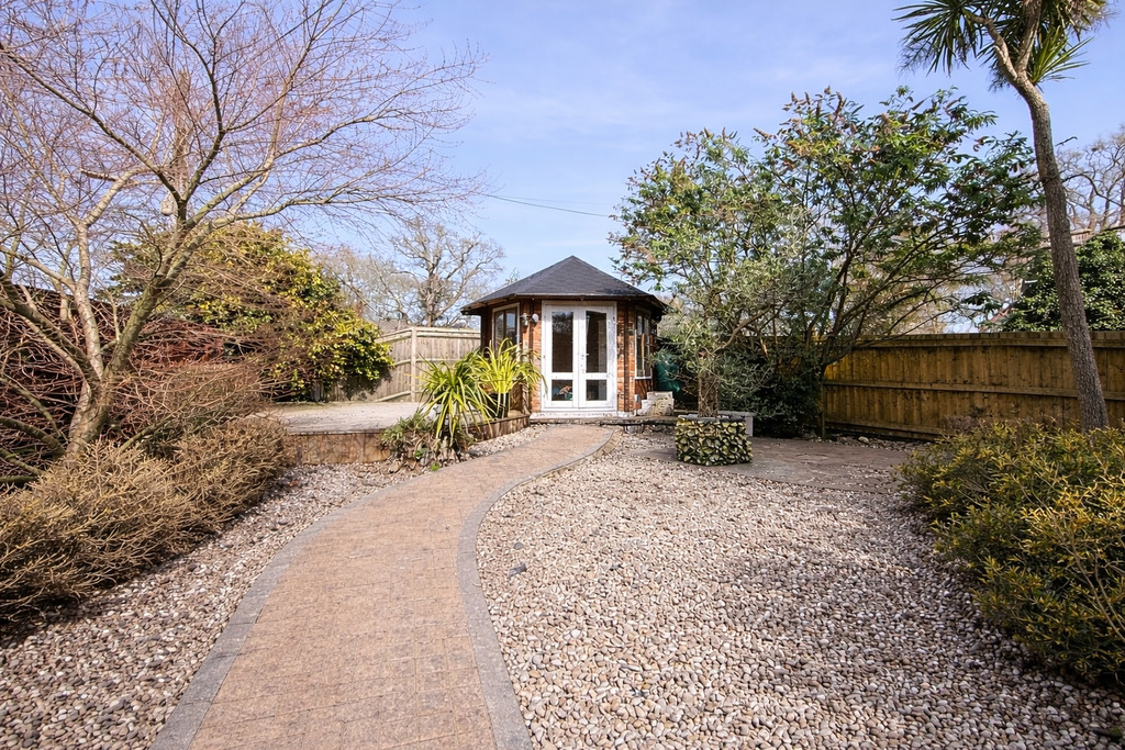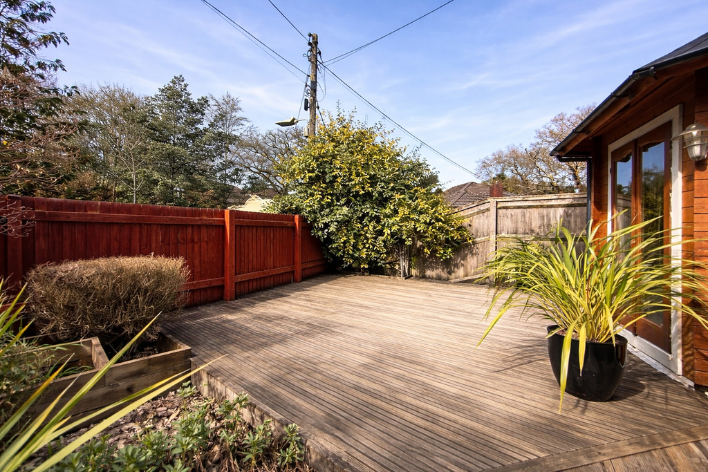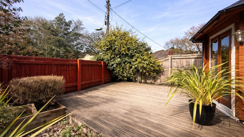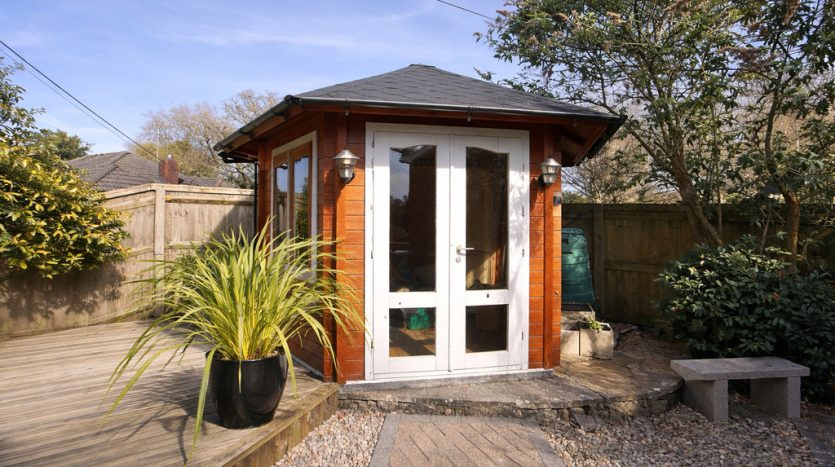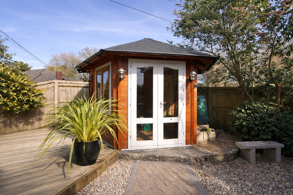 Outside enclosed Garden with Summer house and decking area , and enclosed parking behind gates.