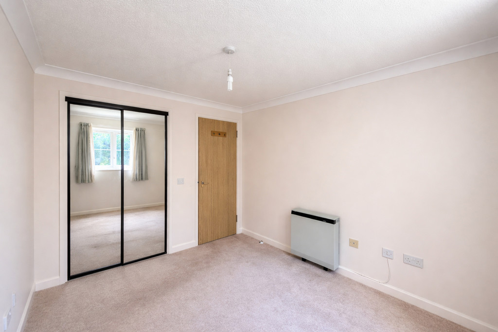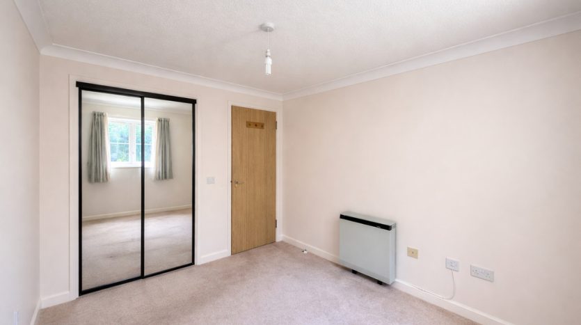 BEDROOM 10′ 10" x 8′ 8" (3.3m x 2.64m) Step into this inviting double bedroom, offering both comfort and functionality in a well-maintained setting. The room is enhanced by a front aspect double glazed window that fills the space with natural light, complemented by a beige carpet underfoot. Ample storage is provided through a built-in mirrored wardrobe, maximising space and reflecting light throughout the room, while a storage heater ensures year-round warmth and comfort.