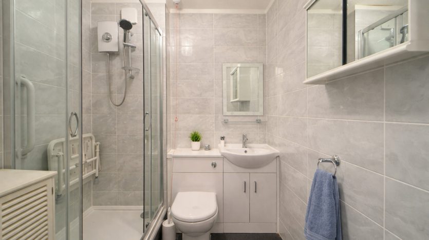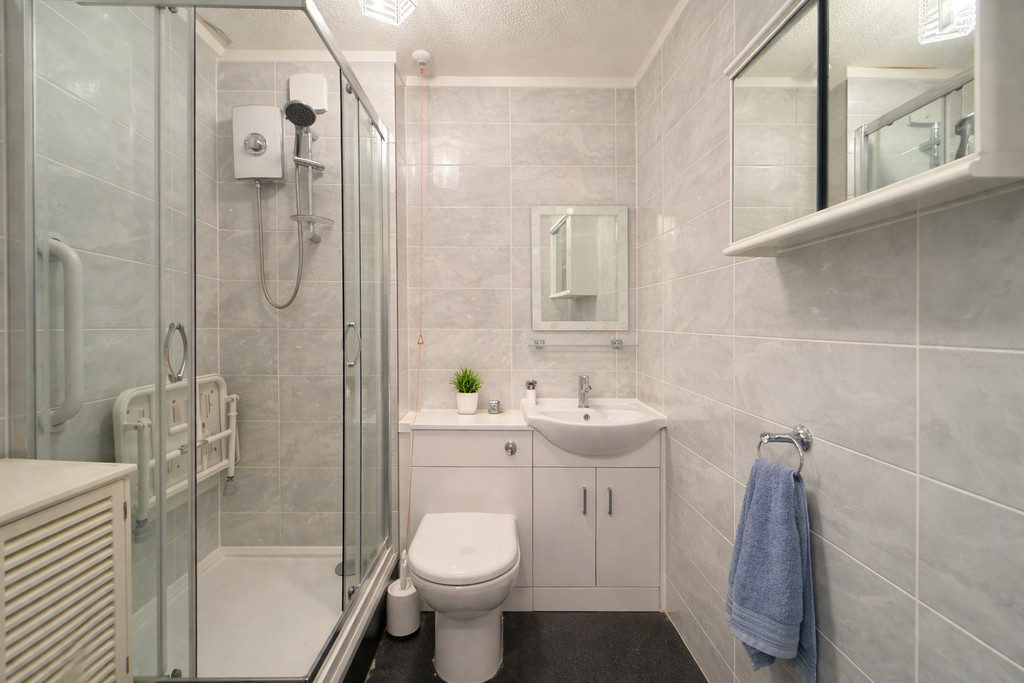BATHROOM Presenting a thoughtfully designed bathroom, combining practicality with modern style. Light grey wall tiles and complimentary charcoal vinyl flooring create a fresh, contemporary look. The bathroom features a convenient walk-in shower cubicle, equipped with an electric shower, sturdy hand rails, and a comfortable shower seat-perfect for both relaxation and accessibility. A white fitted sink and WC unit are seamlessly built into a handy storage cupboard, with a matching vanity wall unit and an additional free-standing storage solution, maximising space and ensuring a clutter-free environment.