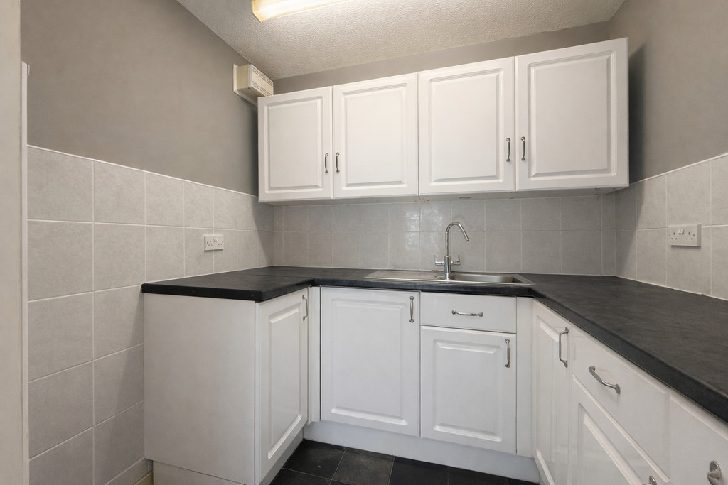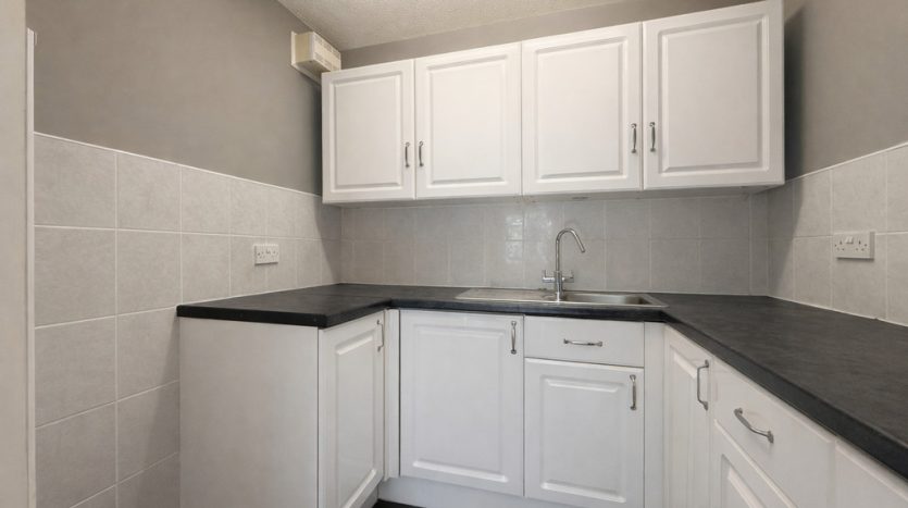 KITCHEN 7′ 2" x 5′ 6" (2.18m x 1.68m) Kitchen designed for both practicality and style, featuring contemporary charcoal vinyl flooring and crisp white cabinetry that offers ample storage. The workspace is finished with a sleek laminate charcoal worktop and a stainless steel sink unit, complemented by on-trend grey splashback tiles. Adjacent is designated space for a cooker, tailored to suit your culinary needs.