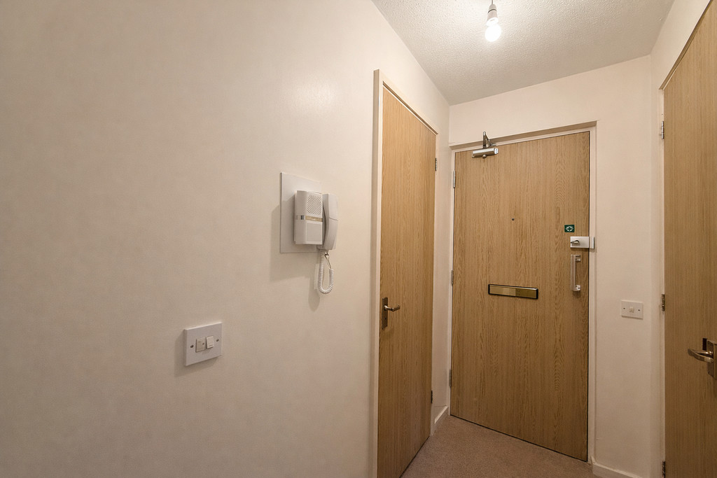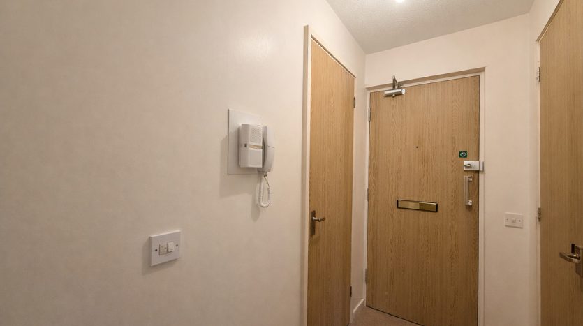 HALLWAY Entrance hall, elegantly fitted with a handsome wooden front door ,beige carpet and Enjoy the convenience of a double-door storage cupboard, ideal for coats and shoes, while the integrated intercom system offers secure access and peace of mind. Every room can be reached effortlessly from this central hallway, promising elegant flow and accessibility throughout.