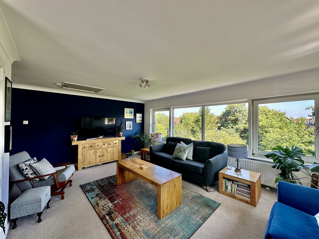A co-ordinating large display unit in the dining area provides yet more storage cupboards, display shelving, and additional work surface and houses a built in fridge. The double patio doors leading out onto the balcony, along with the double aspect windows make this a lovely light and airy room.