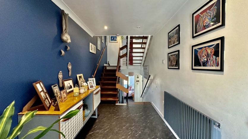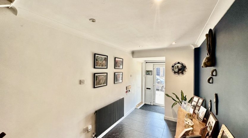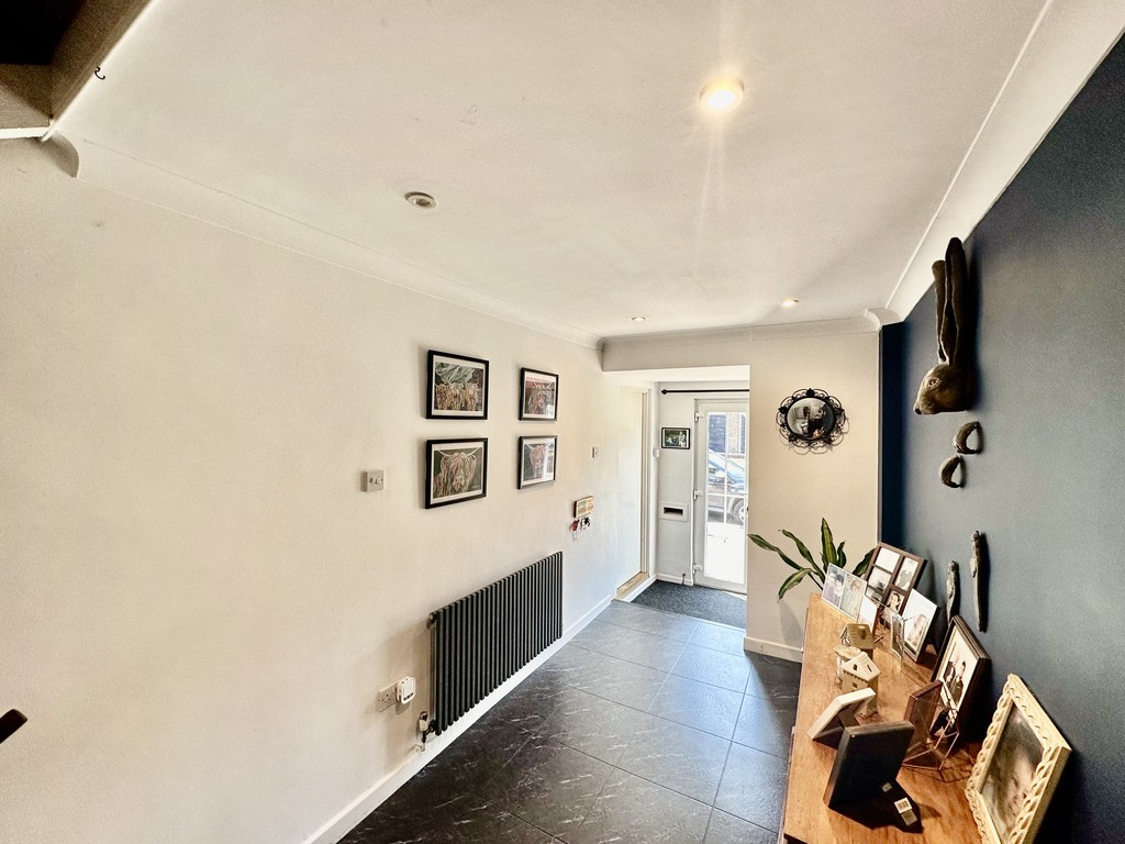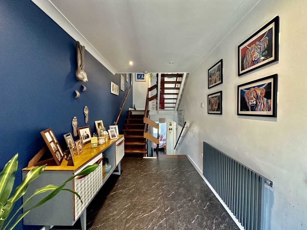 HALLWAY 18′ 9" x 10′ 5" (5.72m x 3.18m) This spacious hallway has stairs to the lower floor where you will find 2 bedrooms and a shower room, and there are also stairs leading up to the master bedroom and bathroom. The welcoming hallway itself has a quality tile effect flooring and is currently set with a sideboard, and there is also a radiator.