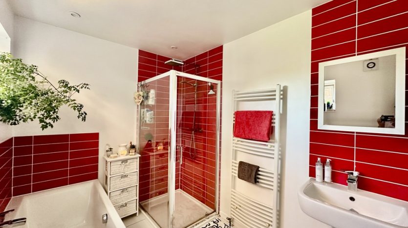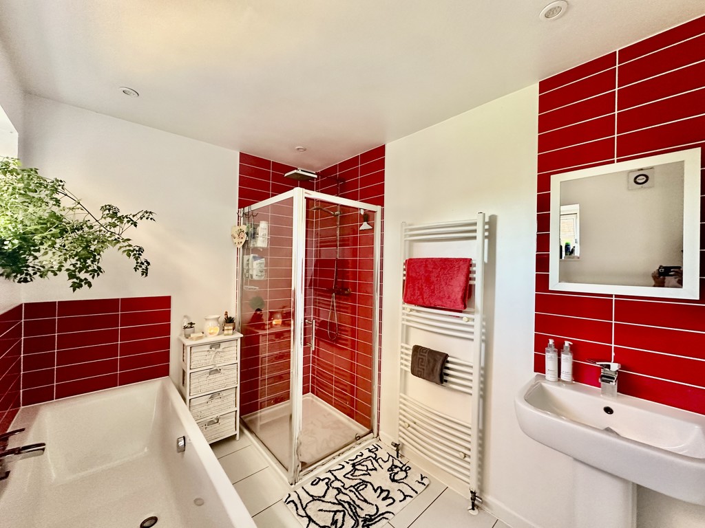 BATHROOM 9′ 7" x 6′ 7" (2.92m x 2.01m) This stunning family bathroom is on the first floor. It has a modern white suite with a bath, a large walk in shower cubicle with waterfall shower, a low level W.C and a pedestal wash hand basin with chrome mixer tap. The shower cubicle is fully tiled an attractive red tiling, and the bath and wash hand basin have co-ordinating tiled splashbacks. There is also a large white heated towel rail, and the floor is fully tiled.