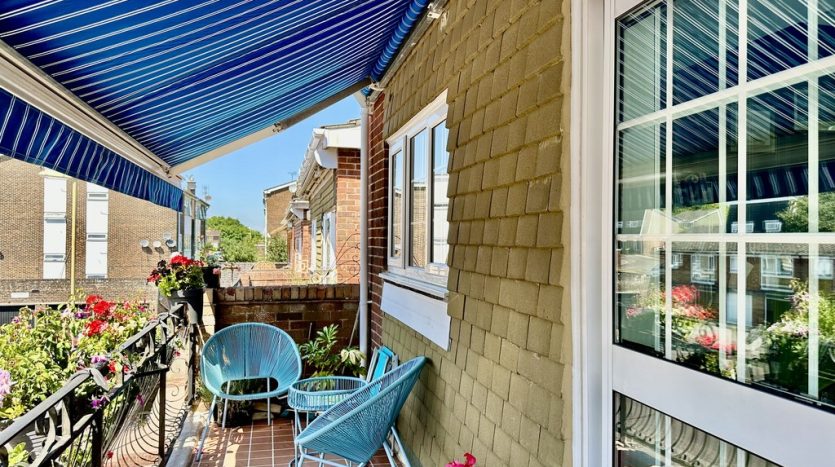 BALCONY The balcony is accessed from the kitchen diner on the 2nd floor through double patio doors and has high spec resin flooring. There are walls to each side with ornamental metal railings at the front. There is room for garden chairs and the balcony is fitted with an awning.