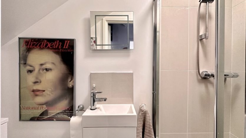 SHOWER ROOM 7′ 3" x 2′ 5" (2.21m x 0.74m) This modern shower room is on the lower floor and is fitted with a contemporary white suite. There is a fitted shower cubicle, a wash basin with chrome mixer tap and a useful vanity cupboard, and a low level W.C. The floor is tiled to match the hallway. The shower has attractive tiling with a modern feature inset, and there is a matching tiled splashback above the basin.