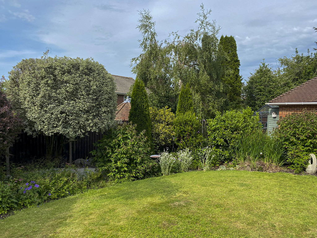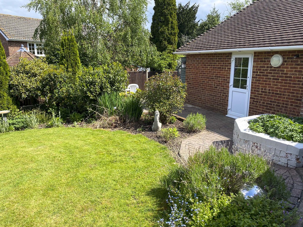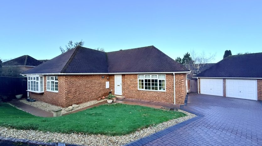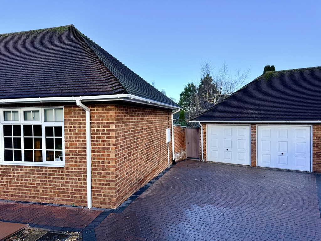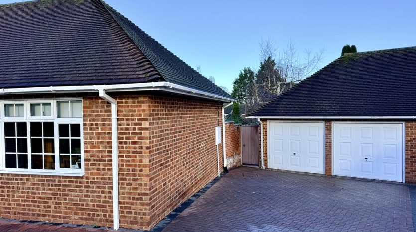 OUTSIDE FRONT Set in a quiet cul de sac the bungalow has a driveway with parking, and access to the double garage. The gardens are laid mainly to lawn and there are mature shrubs and trees.