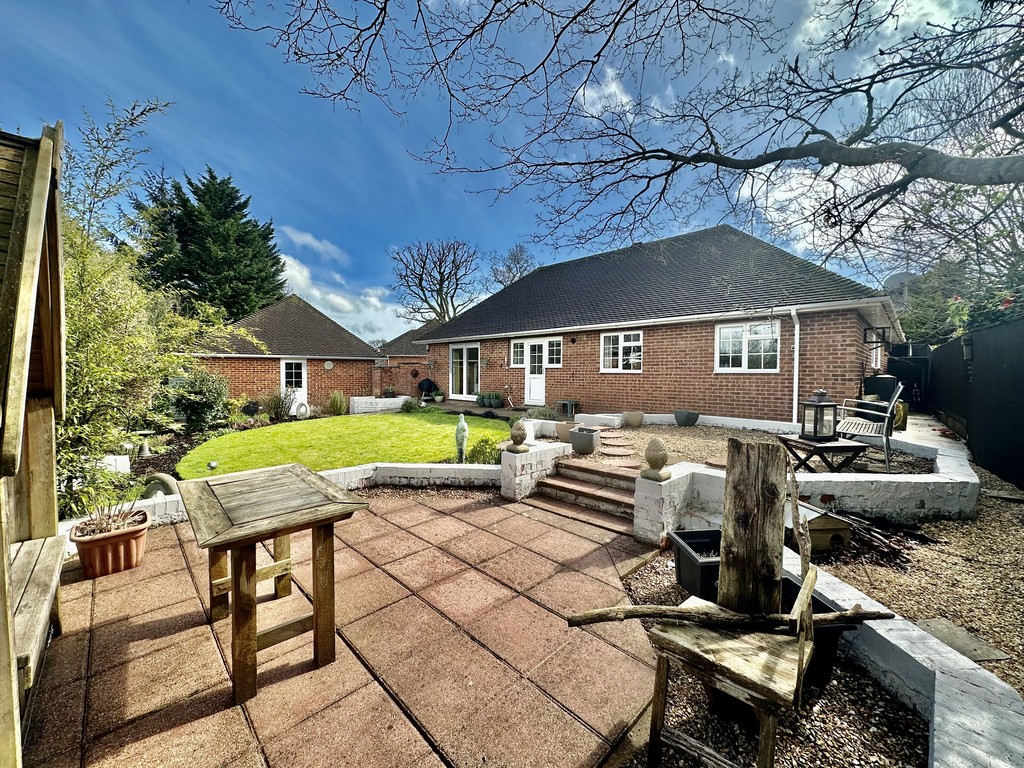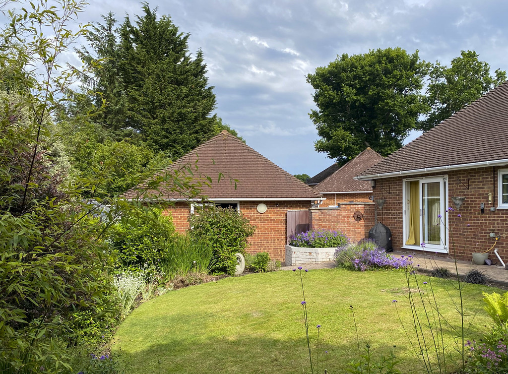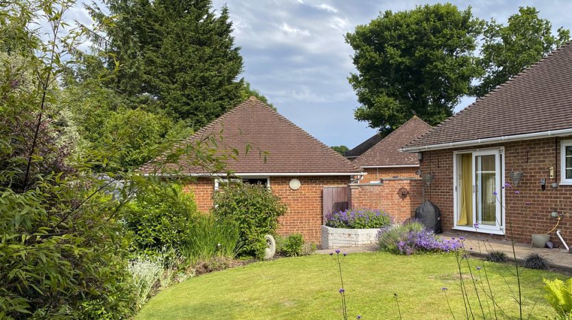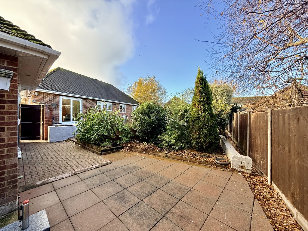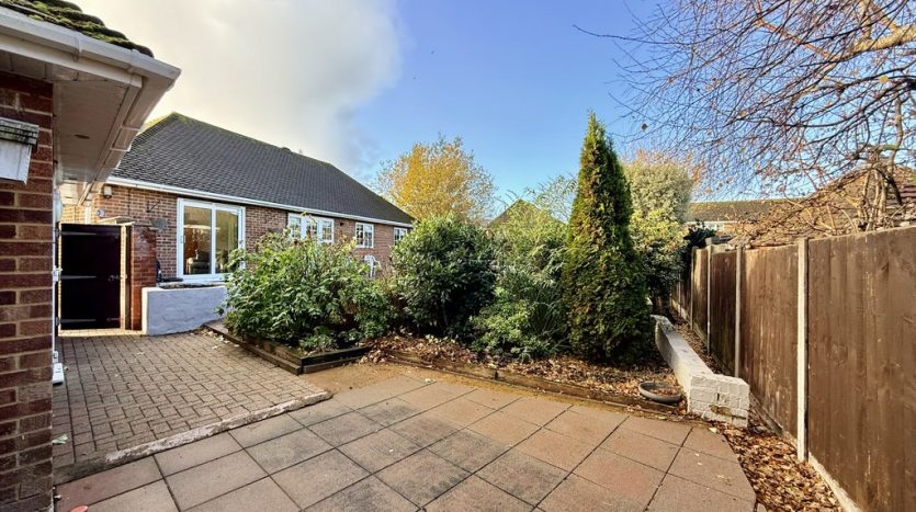 OUTSIDE FRONT Set in a quiet cul de sac the bungalow has a driveway with parking, and access to the double garage. The gardens are laid mainly to lawn and there are mature shrubs and trees.