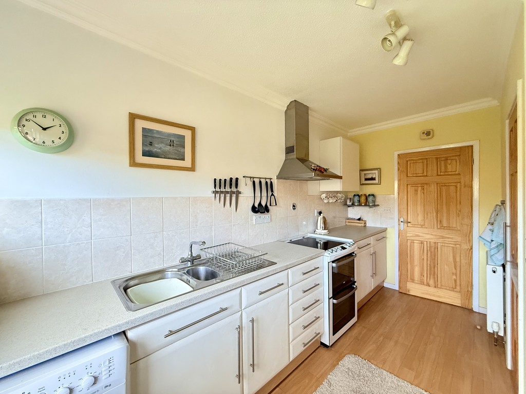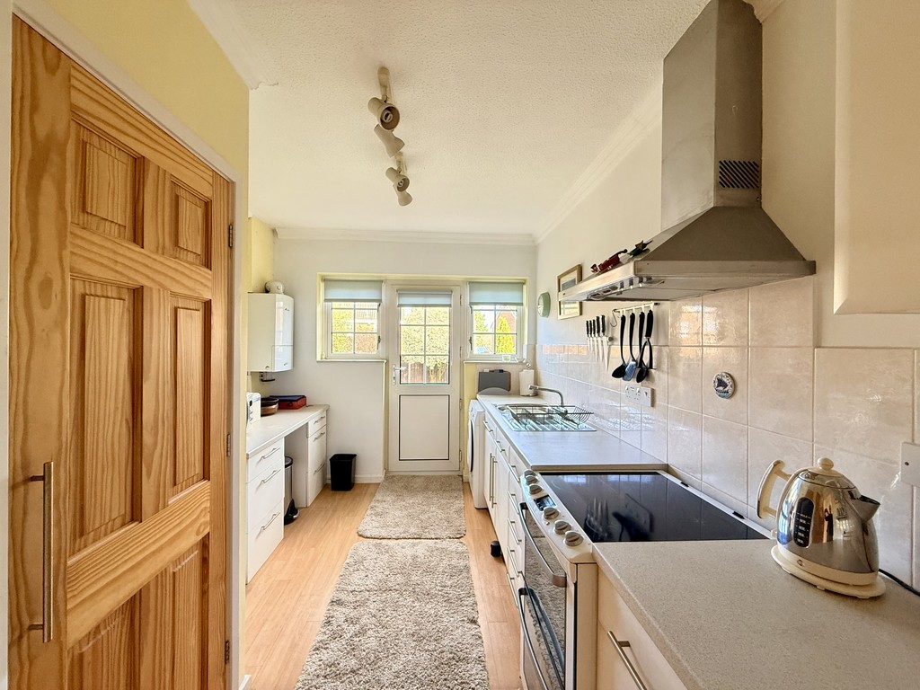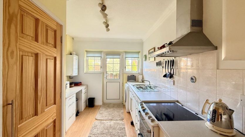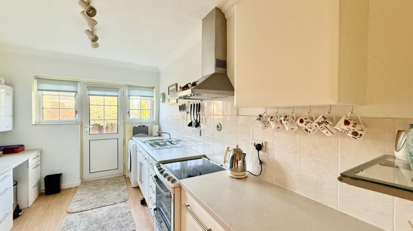 KITCHEN 13′ 1" x 8′ 9" (3.99m x 2.67m) This light and bright room has a good range of base units and drawers, and wall units in a modern white finish, complimented with light grey worktops and cream tiled splashbacks. There is a 1 1/2 bowl stainless steel sink and drainer with chrome mixer tap, and there is a wall mounted Worcester boiler. There is a free standing Zanussi electric oven and Zanussi extractor hood. There is space and plumbing for a washing machine and space for a fridge freezer. The kitchen has a half glazed UPVC door with side windows which allow plenty of natural light into the room, and the door leads out to the rear garden. The kitchen benefits from a full height pantry, providing yet more useful storage.