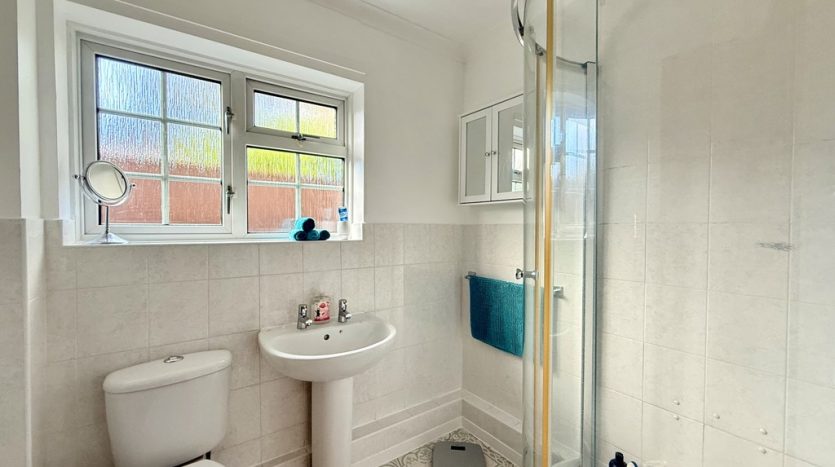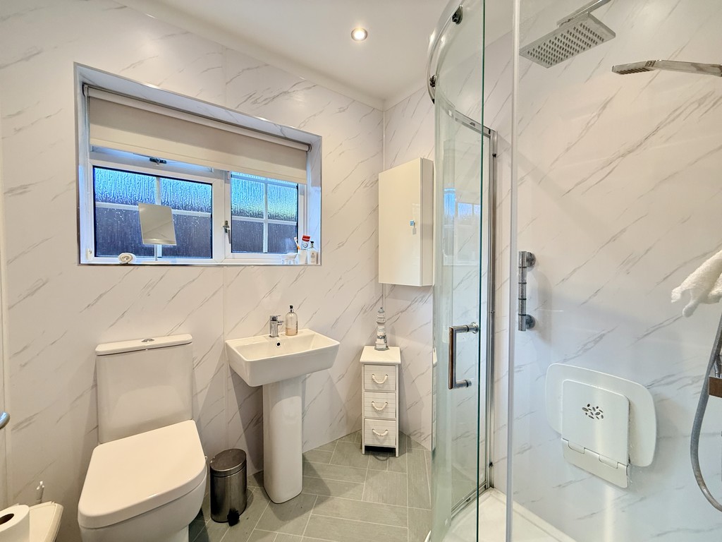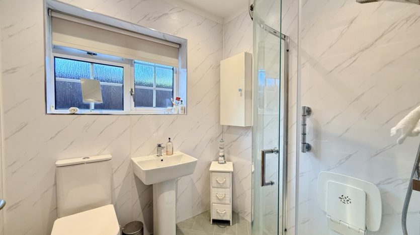 ENSUITE 5′ 9" x 6′ 4" (1.75m x 1.93m) The en-suite shower room has a modern white suite with a pedestal vanity wash basin and a low level W.C. There is an enclosed walk -in quadrant shower cubicle with a mains waterfall shower. The room has marble panelled walls for easy cleaning, and vinyl flooring.. There is a large heated chrome towel rail, and the privacy window lets natural light into the room.