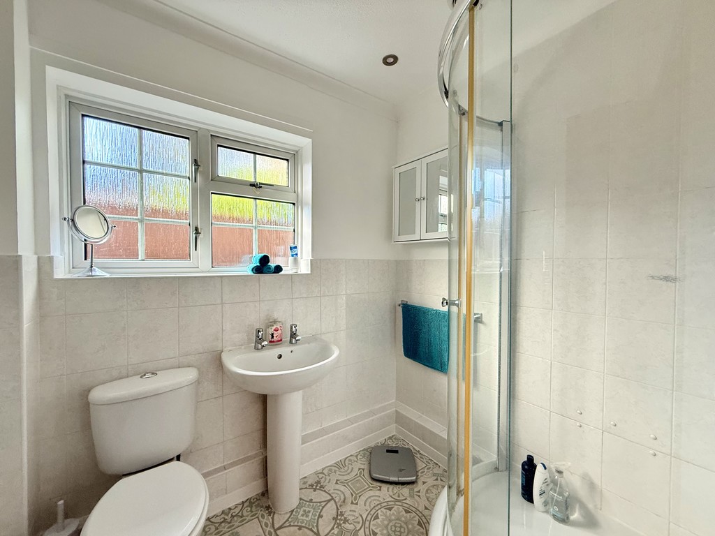 BATHROOM 5′ 9" x 7′ 2" (1.75m x 2.18m) The bathroom is accessed from the hallway and has a modern white suite comprising of a pedestal vanity wash basin and a low level W.C. There is an enclosed walk in quadrant shower cubicle with fitted mains shower and is fully tiled with modern white tiling. There is a privacy window giving natural light, and there is attractive vinyl flooring. The room benefits from a large heated chrome towel rail.