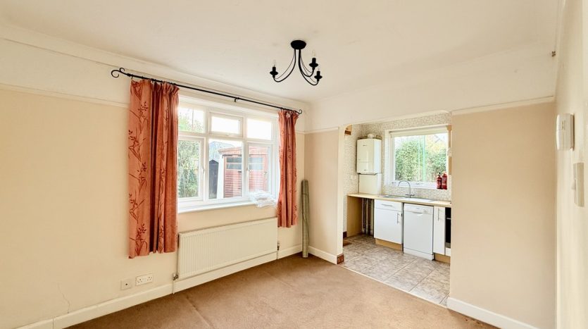 DINING ROOM 11′ 1" x 9′ 4" (3.38m x 2.84m) A spacious dining room-ideal for entertaining family and friends. The dining area seamlessly connects to a modern kitchen via a charming open archway, while a cleverly placed serving hatch to the lounge brings both function and character to the living space. A side aspect window bathes the room in natural light, creating a bright and uplifting atmosphere throughout.