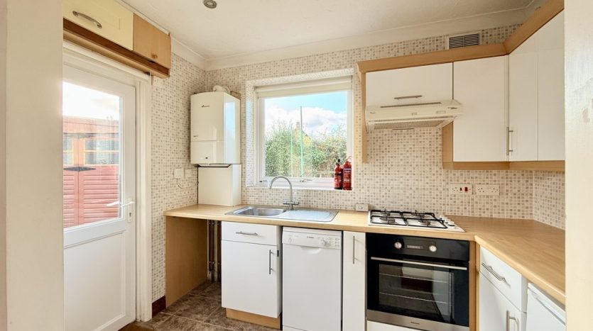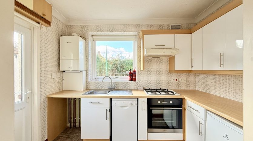 KITCHEN 9′ 4" x 5′ 5" (2.84m x 1.65m) The kitchen is a well-designed space featuring stylish ceramic floor tiles and a range of white wall and base units with oak trim, complemented by mosaic tiled splashbacks and attractive light oak worktops. A rear aspect window fills the room with natural light, and there is ample space for a fridge freezer and washing machine, alongside a fitted Bosch slimline dishwasher for added convenience. There is a wall hung Worcester boiler, and the kitchen benefits from a built-in electric oven and extractor, gas hob, and a practical stainless steel sink and drainer. The kitchen’s side door provides easy access to the garden.