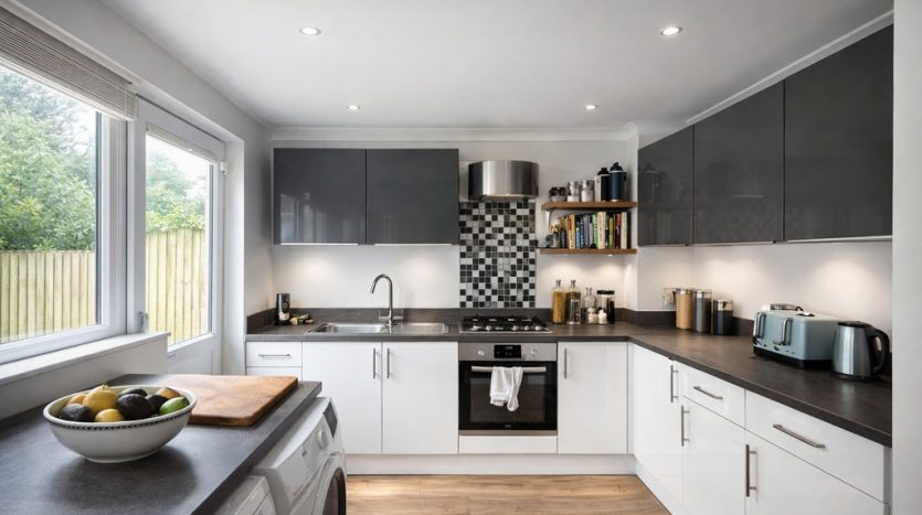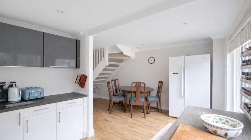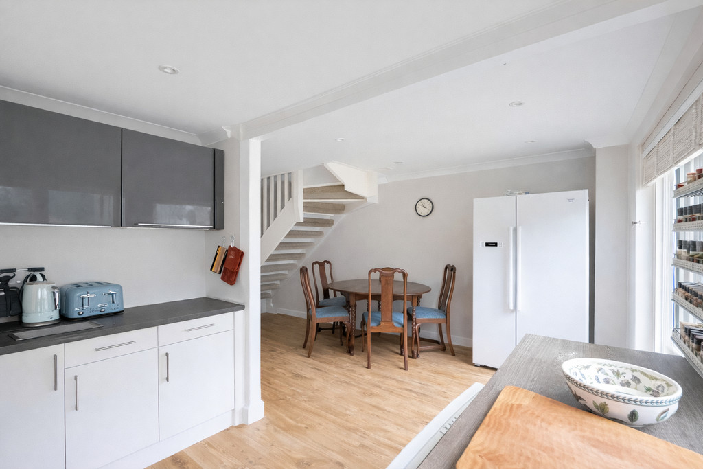 At-home cooks will appreciate the modern built-in oven and gas hob complemented by stylish mosaic tiling and a stainless steel sink. Practicality has been considered at every turn, with designated space for a washing machine and a fridge-freezer, along with a built-in slimline dishwasher for effortless clean-ups. The layout benefits further from a dedicated area for a table and chairs, creating a versatile, sociable space for meals or entertaining.