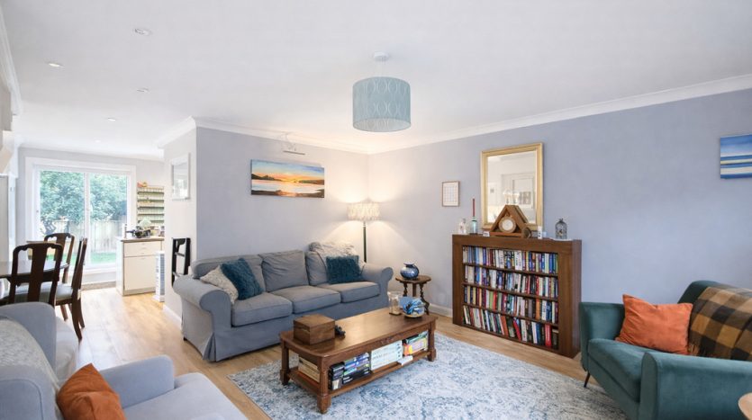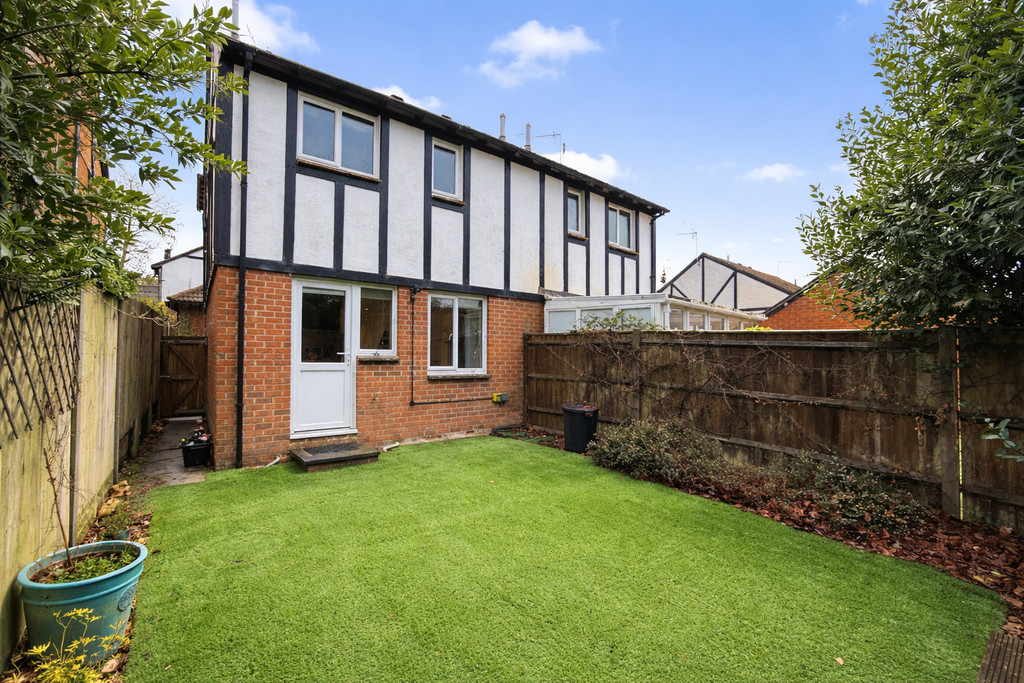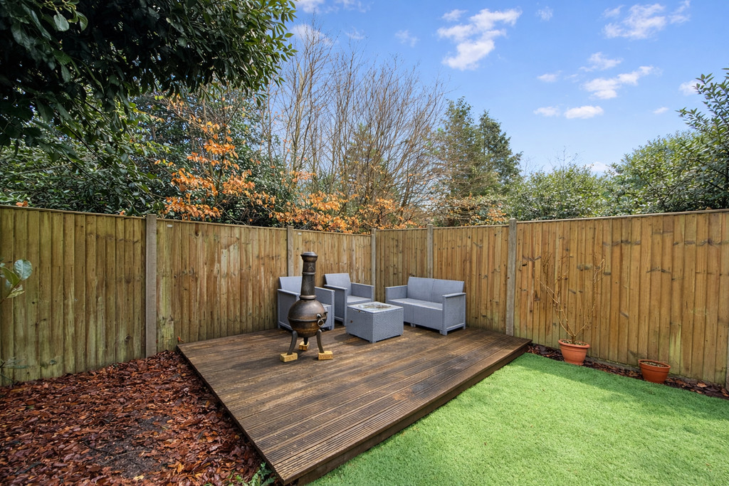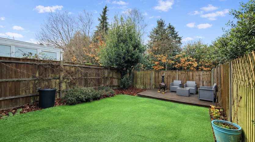 OUTSIDE REAR Enclosed rear garden-an ideal spot for both entertaining and relaxation. The charming, low-maintenance artificial lawn creates a lush, green ambience all year round, complemented by a raised decking area to the rear, perfect for those summer barbecues or an evening unwinding with friends. This peaceful outdoor haven enjoys the benefit of not being overlooked, providing that rarely found sense of privacy.