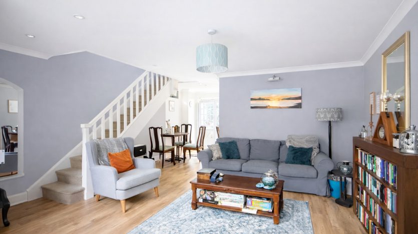 LOUNGE 16′ 7" x 14′ 8" (5.05m x 4.47m) The highlight of the home is its spacious lounge, beautifully enhanced by a striking front aspect leaded double glazed window that fills the room with natural light. Oak effect laminate flooring adds a touch of elegance, while efficient radiators ensure warmth throughout the year. An inviting staircase leads to the upper level, and there is a seamless flow through to the well-designed kitchen and dining area-perfect for gatherings and family dinners.
