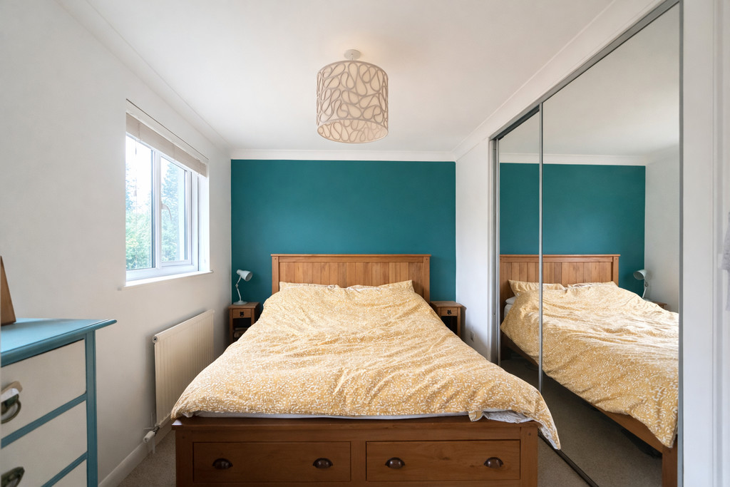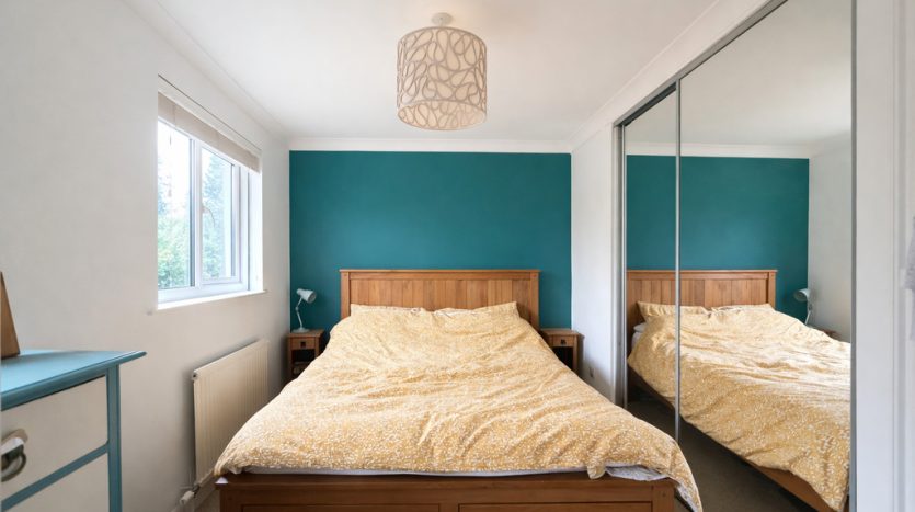 MASTER BEDROOM 11′ 6" x 7′ 9" (3.51m x 2.36m) Master bedroom, thoughtfully designed for both comfort and style. Large rear-aspect UPVC double-glazed windows bathe the room in natural light while providing elevated views of the quiet surroundings. Plush beige carpets create a welcomed atmosphere of warmth underfoot, and built-in mirrored wardrobes deliver ample storage, seamlessly enhancing the room’s modern feel.