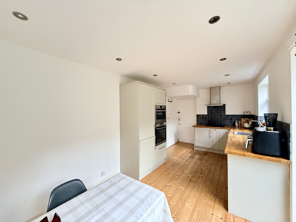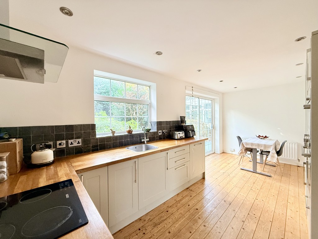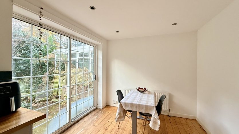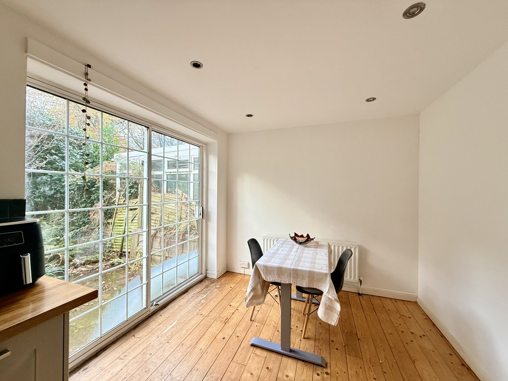 The spacious dining area, bathed in natural light thanks to patio doors opening onto the rear garden, offers ample room for a family table and chairs, making it perfect for both everyday living and entertaining. The wooden floor boards continue from the hallway and lounge.