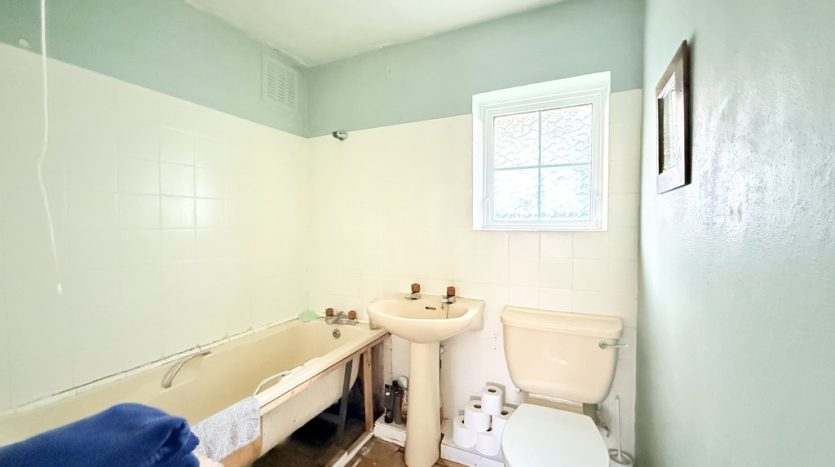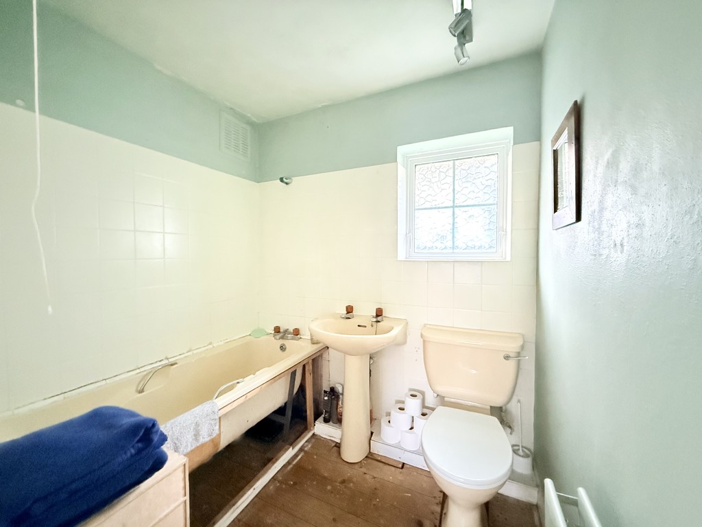BATHROOM 6′ 4" x 5′ 5" (1.93m x 1.65m) The bathroom is fitted with a cream suite complete with bath, W.C, and pedestal wash hand basin. The walls are part tiled in white, and there is a rear aspect privacy window. and wooden floorboards.
