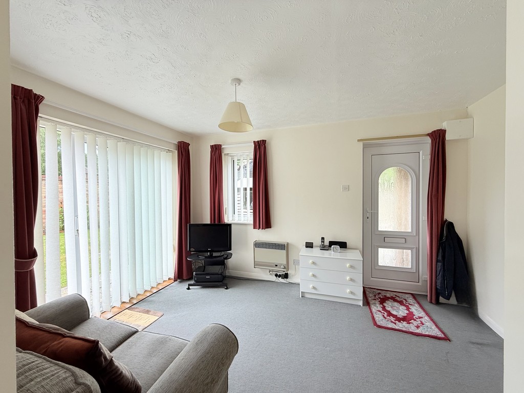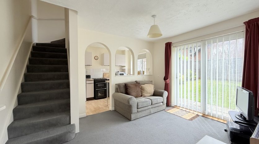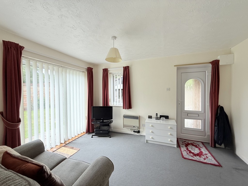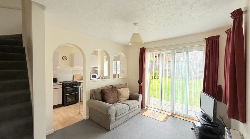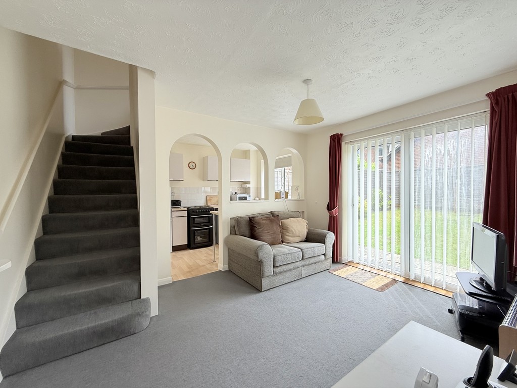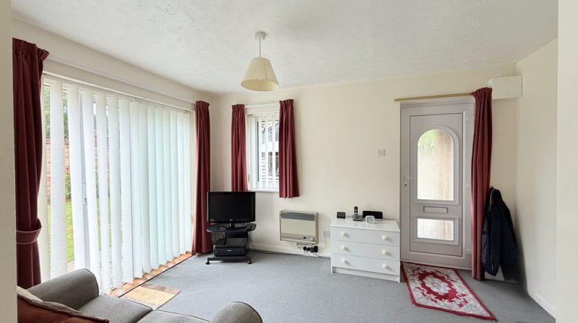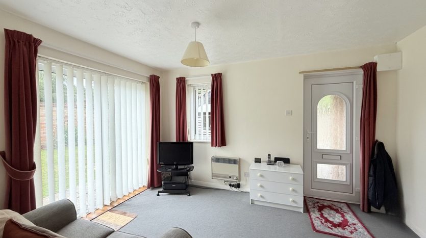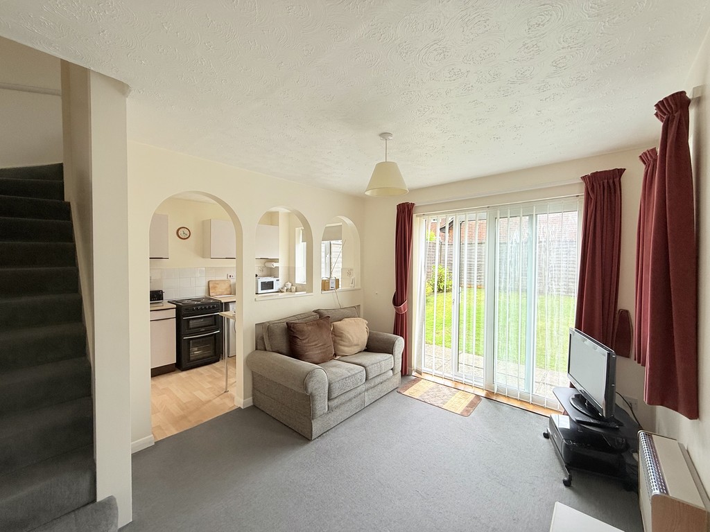 LOUNGE 12′ 8" x 9′ 10" (3.86m x 3m) A light and bright lounge, complete with side aspect patio doors leading to the garden, and a front aspect double glazed window , both flooding the room with natural light. The room features a modern grey carpet and a Baxi wall mounted gas heater, and there is room for a sofa and lounge furniture.