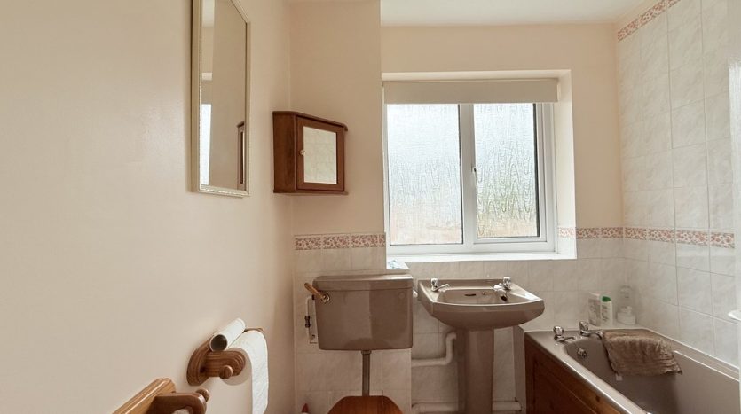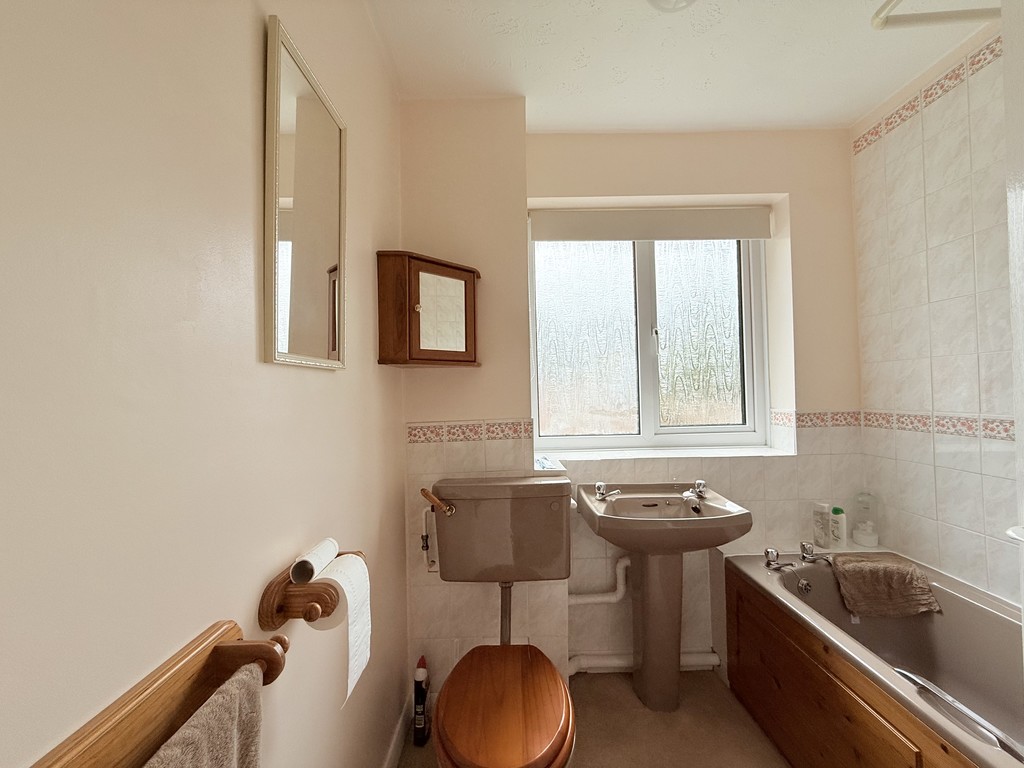 BATHROOM 6′ 5" x 6′ 0" (1.96m x 1.83m) This lovely home features a bathroom with a taupe suite, complete with a bath and electric shower. The room also includes a pedestal wash hand basin, a W.C, and a side aspect double glazed window allowing natural light to flood in. The walls are tastefully part tiled with cream marble effect tiles.