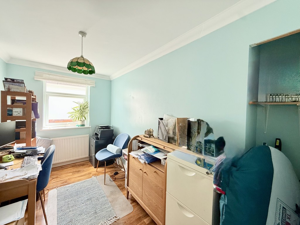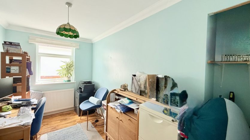 BEDROOM THREE 12′ x 9′ 89" (3.66m x 5m) A versatile third bedroom currently utilised as a tranquil home office. The walnut flooring flows seamlessly from the hallway, a side aspect window that ensures a light and airy ambiance-an ideal space for work, creativity, or relaxation.