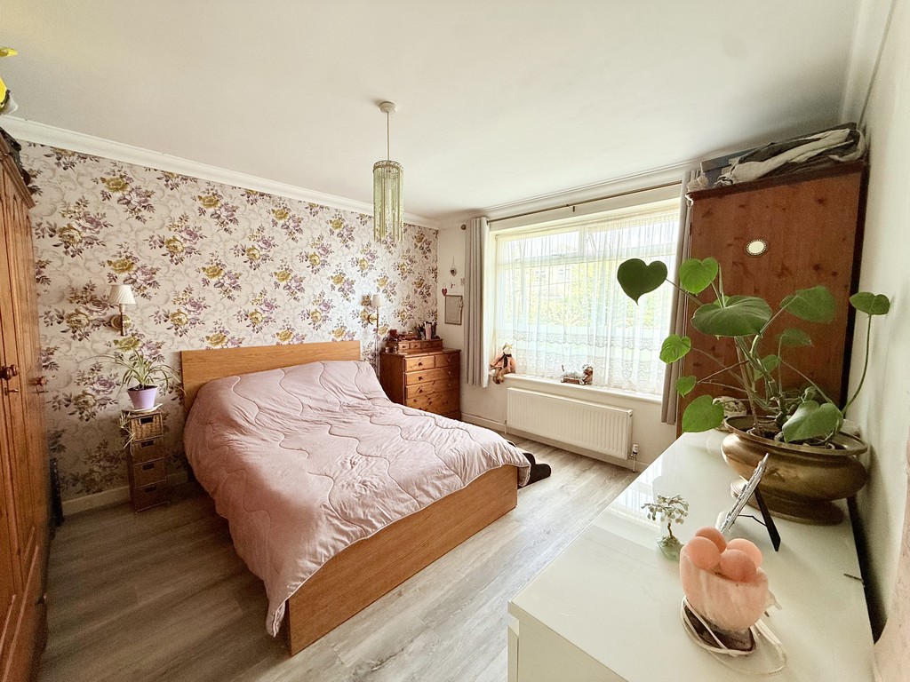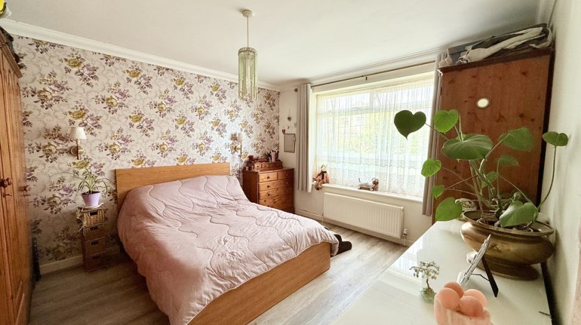 MASTER BEDROOM 13′ 20" x 11′ 45" (4.47m x 4.5m) The generous main bedroom boasts ample space for a large bed, wardrobes, and additional bedroom furniture. There is a large front aspect window making this a light and bright room and the room is fitted with laminate wood effect flooring