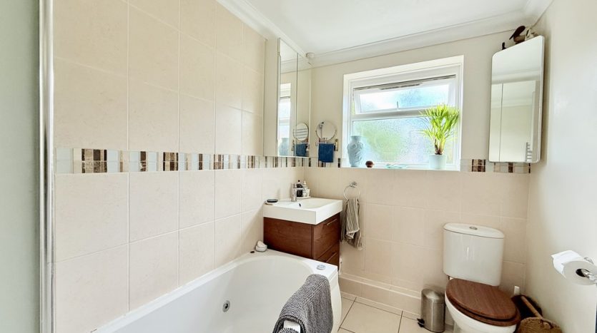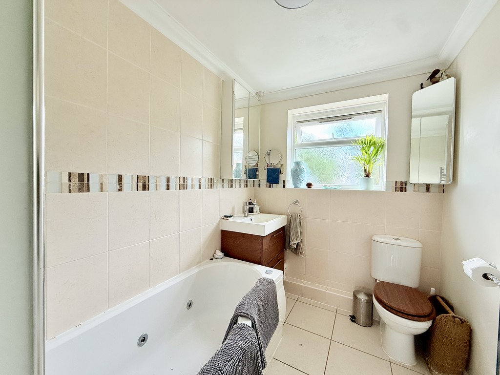 BATHROOM 7′ 99" x 6′ 06" (4.65m x 1.98m) The bathroom has white floor tiles and the private rear aspect window that fills the space with natural light. A modern white suite includes a luxurious jacuzzi bath with shower over, and a fitted shower screen. The cream marble wall tiles have an attractive bespoke mosaic trim. There is a W.C and thoughtful touches such as a contemporary square vanity basin with oak-effect storage drawers, a fitted mirrored cabinet and a large chrome heated towel rail enhance both style and practicality.
