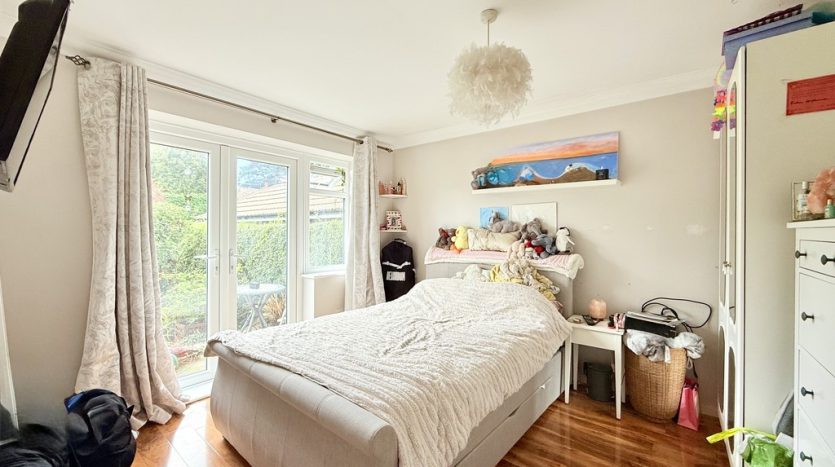 BEDROOM TWO 12′ 75" x 10′ 24" (5.56m x 3.66m) Bedroom two has generous proportions with ample room for a bed and bedroom furniture. This would make a lovely guest or children’s bedroom. The double patio doors opening directly onto the rear garden, create a bright and airy room.