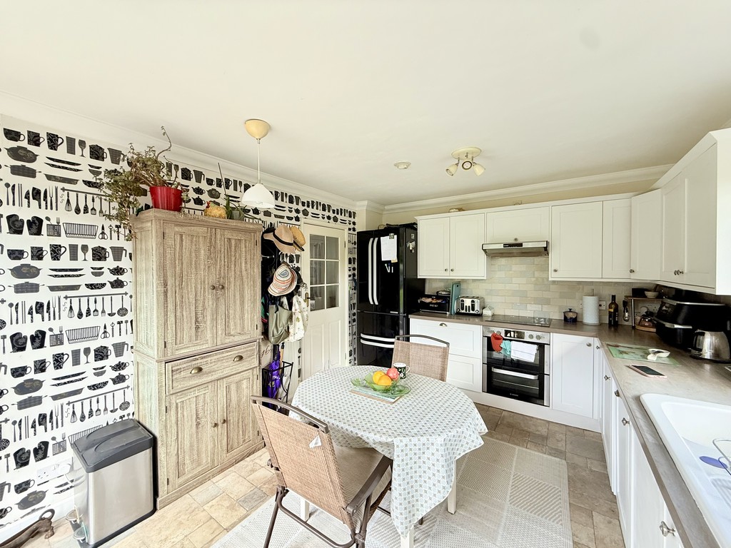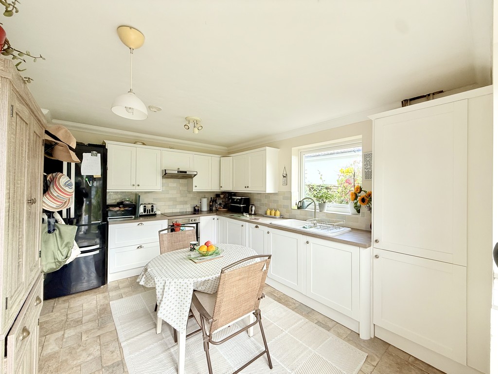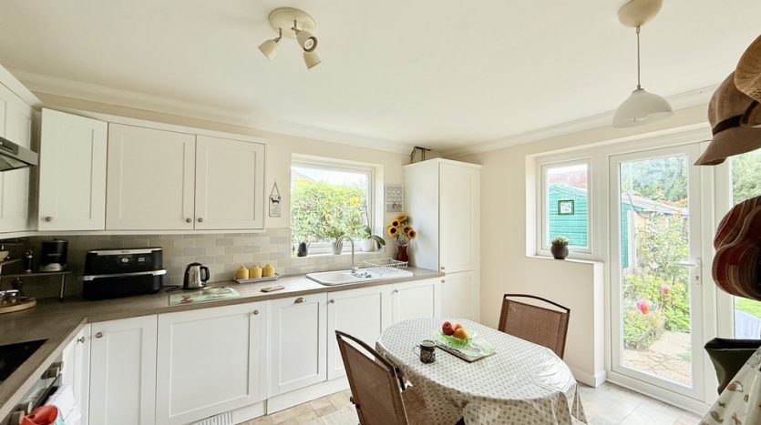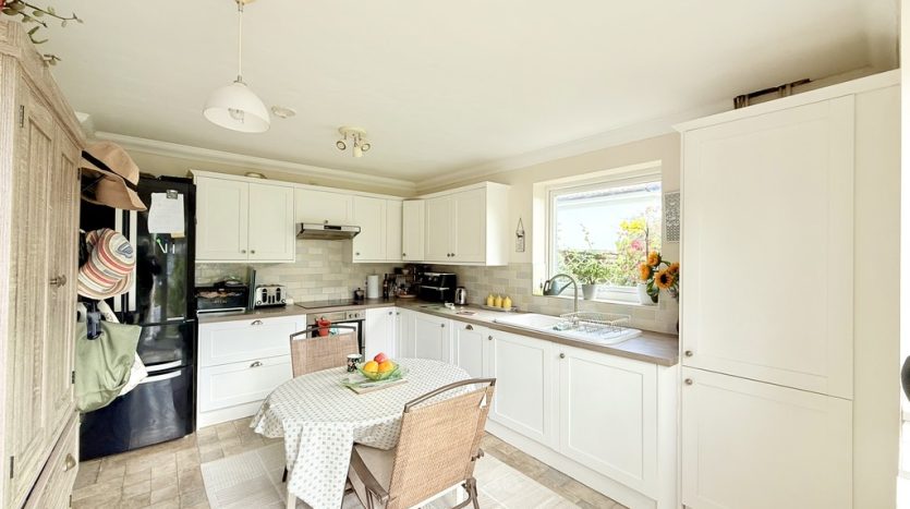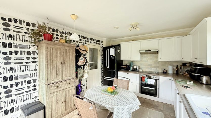 KITCHEN/BREAKFAST ROOM 13′ 20" x 11′ 45" (4.47m x 4.5m) A stylish and well-equipped kitchen with room for a table and chairs. Boasting a vinyl floor for easy maintenance, the kitchen is fitted with high-quality appliances including a Hoover oven, Hotpoint hob, Bosch extractor, and a slimline dishwasher. There’s plenty of practicality with space for both a washing machine and tumble dryer, along with a generous fridge freezer. An excellent range of white base and wall units is complemented by sleek wood-effect worktops, attractive tiled splashbacks, and a stone sink and a half bowl drainer with a modern chrome mixer tap. The kitchen benefits from an abundance of natural light, with a picture window offering a side aspect, and double patio doors that open directly onto the private rear garden.